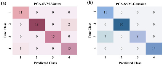 Confusion matrices for the PCA-SVM classification model under vortex beam-induced LIBS (a) and Gaussian beam-induced LIBS (b).