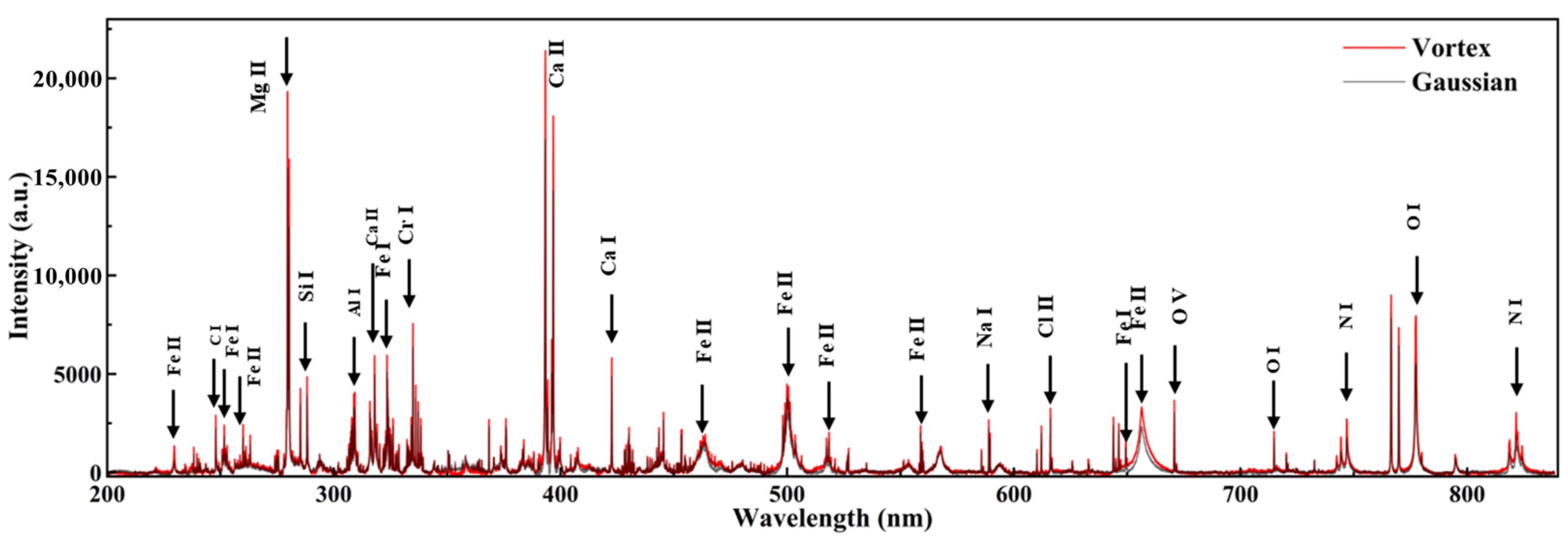 - Wang, Q.; Dang, W.; Jiang, Y.; Chen, A.; Jin, M. Emission Enhancement of Femtosecond Laser-Induced Breakdown Spectroscopy Using Vortex Beam. J. Phys. B At. Mol. Opt. Phys. 2022, 55, 095402. [Google Scholar] [CrossRef]