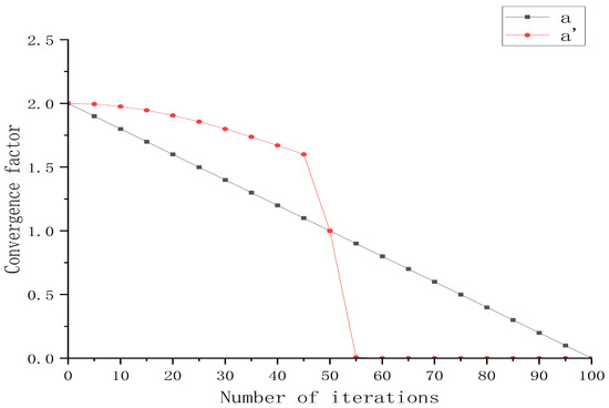 As shown in Figure 3, At the beginning of the iteration, the downward trend of a’ is relatively gentle, which can maintain A large value for a long time, promoting the A value to remain at a high level and effectively extending the global search time. The global search ability and convergence speed of the algorithm rapidly decay from a higher value to a lower value in the middle of the iteration, achieving a rapid transition from global search to local search. Maintain a relatively low value in the later stage of iteration to ensure the local search performance of the algorithm.