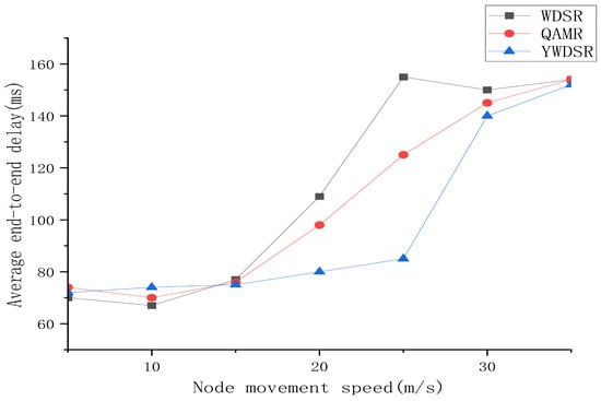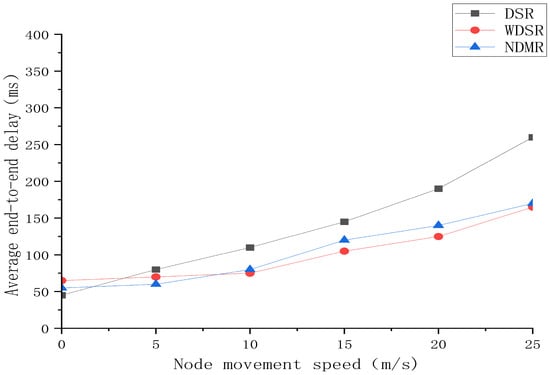 It can be seen from Figure 5 that when the node movement speed of the wireless Mesh network is relatively slow, the average end-to-end delay of the DSR protocol is the smallest. This is because the DSR protocol does not need to frequently search for new routing paths. However, even when nodes are stationary, the WDSR protocol needs to continuously detect the state of the network, which makes its average end-to-end delay higher than that of the DSR protocol. However, as the speed of node movement increases, the topological structure of the network begins to change frequently. The DSR protocol requires frequent route discovery, while the WDSR protocol can promptly sense changes in the network topology. At this point, the average end-to-end delay of the WDSR protocol is superior to the other two algorithms.