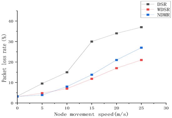 Figure 6 shows the packet loss rate varying with the speed of node movement. When the speed is 0, the packet loss rates of these three protocols are basically the same. However, as the speed of node movement increases, the network topology becomes unstable. The packet loss rate growth rate of the WDSR protocol is significantly lower than that of the DSR protocol. The NDMR protocol adopts a multipath routing strategy to balance network load and improve fault tolerance, so the increase in packet loss rate is relatively slow. The WDSR protocol was modified to a multipath routing protocol based on these important parameter indicators from the very beginning of its design. After comprehensive consideration, the communication connection performance selected by the WDSR protocol is better, thereby improving the fault tolerance rate of the network.