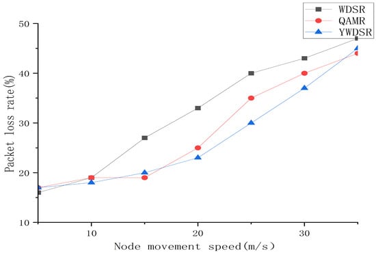 Figure 9 shows that the packet loss rates of the three algorithms change as the number of data streams in the network increases. When the degree of network congestion is low, the packet loss rates of the three algorithms do not differ much. As the degree of network congestion continues to increase, the packet loss rate of algorithms gradually shows differences. YWDSR and QAMR transmit data packets by choosing the optimal path, so the increase in packet loss rate is relatively low. However, the WDSR algorithm is based on the principle of minimum hop count and only selects the path that meets the minimum hop count. It does not specifically consider that when the number of network data streams increases, more data streams are transmitted through the path with the minimum hop count, resulting in a rapid increase in the congestion degree of the path with the minimum hop count. This will lead to a greater decline in network performance. Compared with the QAMR algorithm, the packet loss rate performance of the YWDSR algorithm does not improve much, mainly because both select the optimal path as the transmission path.