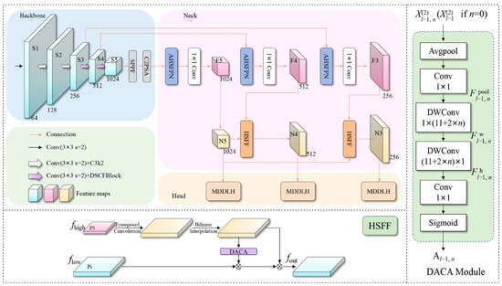 The AHSFPN network employs a hierarchical bi-directional feature fusion strategy, constructing a multi-scale feature fusion framework with adaptive weight allocation by integrating the Directional Adaptive Channel Attention (DACA) module and the Hierarchical Spatial Feature Fusion (HSFF) module at different backbone layers. The core innovation of AHSFPN lies in its attention-guided hierarchical feature propagation mechanism, in which high-level semantic features are weighted and fused with attention-enhanced low-level features, followed by spatial resolution recovery via transposed convolution. The mathematical formulation of the complete feature fusion process is: