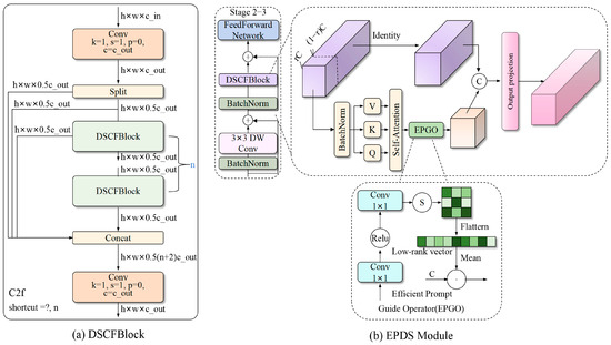 Here, denote the base feature groups obtained from the initial convolutional segmentation, represents the -th EPDS Module processing unit, n is the total number of processing units, and corresponds to the final feature fusion convolution operation.