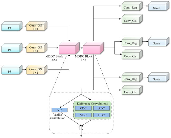 The conventional YOLOv11 detection head relies on standard convolutional operations for feature extraction, which capture spatial correlations only within a fixed receptive field and fail to effectively perceive multi-directional edge information, subtle texture variations, and irregular geometries commonly present in weld defects. Additionally, traditional approaches lack adaptive assessment of feature importance during multi-scale fusion, preventing dynamic adjustment of each feature level’s contribution based on defect type and scale. This often leads to dilution of practical features and amplification of redundant information, adversely affecting detection accuracy and generalization. To address these challenges, we propose the MDDLH module. As shown in Figure 3, MDDLH substantially improves the network’s perception of multi-dimensional weld defect features by integrating a multi-directional differential convolution operator group with an adaptive feature weight adjustment mechanism, while controlling computational complexity through parameter-sharing and reparameterization techniques.