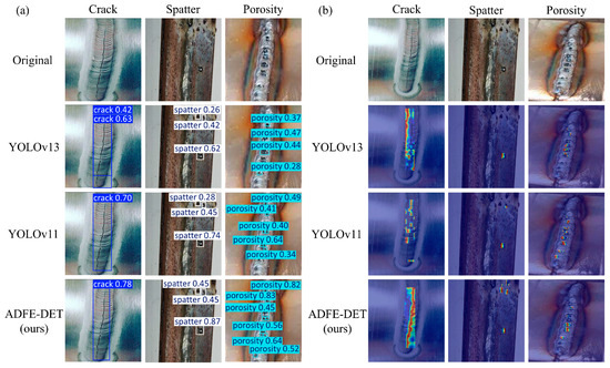 To visualize the detection performance and feature characterization capabilities of ADFE-DET, qualitative experiments were conducted on three typical weld defect types—Crack, Spatter, and Porosity—with results shown in Figure 4. The left side of the figure displays the detection results with bounding boxes, while the right side shows the corresponding Grad-CAM heatmaps to illustrate the spatial attention distribution. Comparative analysis indicates that ADFE-DET achieves superior localization accuracy and feature discrimination across all defect types. For crack defects with long and narrow morphology, the model produces bounding boxes that tightly fit the defect, and the heatmaps show concentrated activation in the crack region with minimal background interference, demonstrating enhanced fine-grained feature extraction. For spatter defects with irregular distribution, the model effectively captures multi-scale spatial features, with attention weights uniformly covering the defect region. For minor, densely distributed porosity defects, ADFE-DET achieves high detection completeness, and the heatmaps reveal stronger, more focused feature responses than those of the YOLOv13 and YOLOv11 baselines. Overall, the adaptive feature enhancement module produces more discriminative feature representations, with clearer, more concentrated activation regions in Grad-CAM visualizations, validating the model’s effectiveness in capturing critical defect features for accurate weld defect detection.