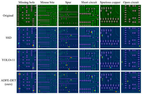 Figure 6 illustrates the Grad-CAM visualizations for six types of PCB defects, highlighting the ADFE-DET’s feature characterization and attention mechanism. The visualizations demonstrate that ADFE-DET exhibits superior feature discrimination and precise localization compared to SSD and YOLOv11 baseline models. For missing hole defects, characterized by circular voids, ADFE-DET shows a highly concentrated activation response with minimal background interference, indicating accurate defect localization. In mouse bite defects with irregular notched PCB edges, the thermograms reveal that attention is tightly focused on the true defect areas, whereas competing methods produce scattered activations in non-defective regions. For spur defects, which present subtle raised features, ADFE-DET captures fine-grained spatial details with more precise and more discriminative activation regions, validating the effectiveness of the adaptive feature enhancement module. Similarly, for short circuit, spurious copper, and open circuit defects, the model consistently produces focused and accurate thermogram responses, with activation strengths precisely aligned with defect boundaries. Overall, the qualitative analysis confirms that ADFE-DET achieves highly discriminative feature representation and an enhanced spatial attention mechanism, enabling accurate PCB defect detection even under complex backgrounds and subtle defect patterns.