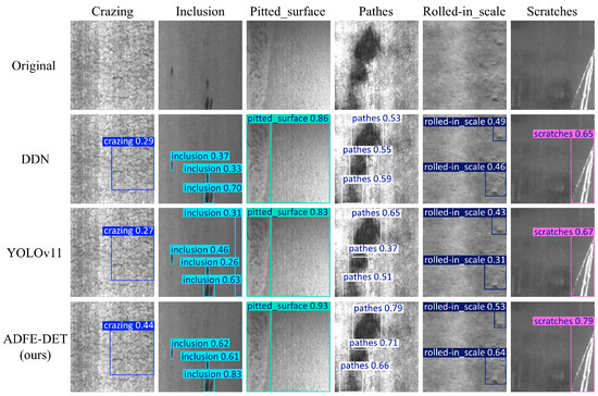 To further validate the generalization ability and robustness of the proposed ADFE-DET model across different industrial defect detection scenarios, cross-dataset evaluation experiments were conducted on the NEU-DET steel surface defects dataset, with results presented in Table 5. The NEU-DET dataset contains six defect types—Cr (cracks), In (inclusions), Pa (plaques), Ps (pitting), Rs (indented oxides), and Sc (scratches)—providing a challenging benchmark for assessing model transferability. Experimental results indicate that ADFE-DET achieves an impressive mAP50 of 83.35%, representing a 2.73% improvement over the baseline YOLOv11n, while maintaining a compact architecture with a 34.1% reduction in parameters and a 4.6% reduction in computational complexity. The model exhibits balanced detection performance across all defect classes, particularly on challenging courses such as Cr, Pa, and Ps, demonstrating the effectiveness of the adaptive feature enhancement mechanism in capturing diverse defect patterns. Compared with other state-of-the-art methods, ADFE-DET achieves competitive accuracy with optimal parameter efficiency: a 1.05% mAP50 improvement over DDN, and substantial gains of 9.75%, 9.55%, and 5.55% compared to lightweight models YOLOv5n (73.6%), YOLOv10n, and YOLOv8n, respectively. Furthermore, it consistently outperforms dedicated architectures such as REDef-DETR and DCA_RFCN, demonstrating strong generalization across heterogeneous defect detection tasks. These cross-dataset results fully demonstrate that ADFE-DET maintains robust performance and excellent transferability, validating its practical applicability in diverse industrial defect inspection scenarios.