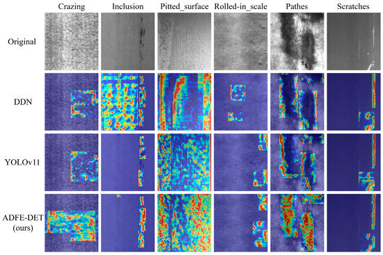 Figure 8 presents the Grad-CAM visualization of representative steel surface defects to illustrate the internal feature representation and attention mechanism of ADFE-DET. The thermogram comparison clearly shows that ADFE-DET exhibits markedly enhanced spatial attention focus and discriminative feature activation relative to baseline models. For Crazing defects with fine-grained crack networks, ADFE-DET produces highly concentrated activation precisely aligned with the defect region, with a transparent red-to-yellow gradient indicating intense feature discrimination, whereas DDN and YOLOv11 show dispersed activation in background regions. In inclusion defects, ADFE-DET generates a focused vertical activation pattern that accurately captures linear defect features, while the baseline shows decentralized responses with reduced spatial specificity. For pitted surface defects exhibiting distributed texture anomalies, ADFE-DET achieves full coverage with uniform high-intensity activation, demonstrating the adaptive feature enhancement mechanism’s ability to capture global defect patterns. For rolled-in scale defects with subtle intensity variations, the model precisely localizes defect boundaries with minimal background interference, as evidenced by sharp transitions in the thermogram. Similarly, for patches and scratches, ADFE-DET consistently produces more focused, semantically meaningful activation patterns, with thermogram intensities closely matching the actual defect locations. Overall, the Grad-CAM analysis confirms that ADFE-DET’s adaptive feature augmentation architecture enables superior spatial attention and discriminative feature representation, facilitating accurate defect detection and precise localization even under complex texture backgrounds and subtle visual variations typical of steel surface inspection tasks.