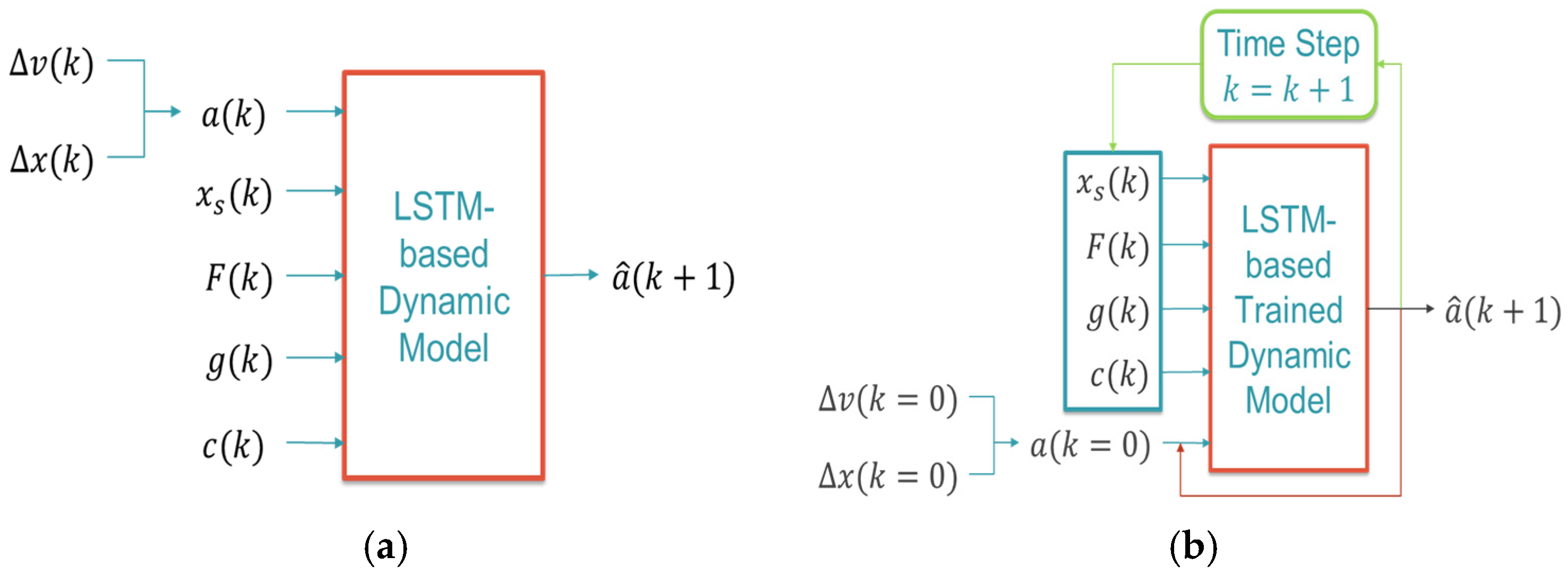 in order to implement data preprocessing for initial acceleration. Then, the feature update process is continuously performed and finally, all these input features enter into the LSTM-based trained dynamic model, which is already trained and loaded this trained model. The predicted output is for the next time step