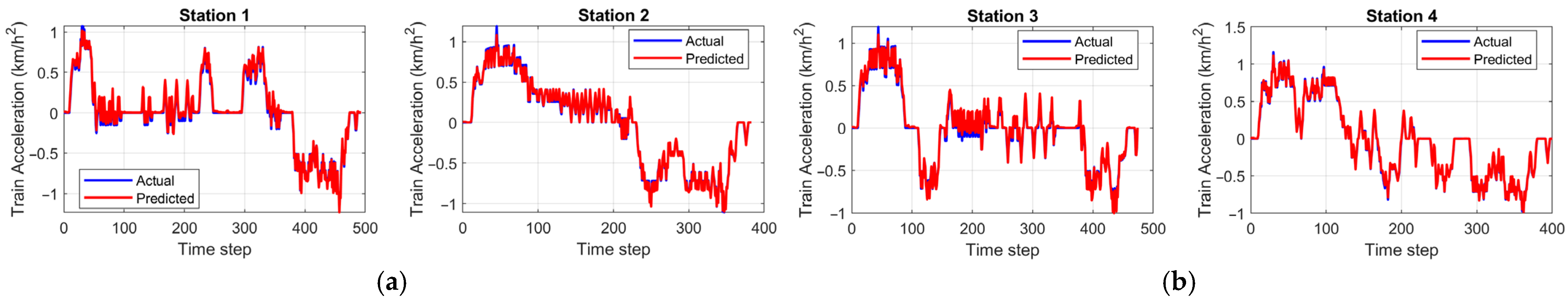Figure 8 illustrate the performance analysis of the model in terms of train acceleration across stations. Stations 1 and 3 demonstrate accurate prediction over sequences (500 time steps) with the complex multi-phase profiles, including rapid acceleration/deceleration transitions, where the proposed model can predict close alignment with the actual values. But the small differences seen during high-frequency oscillations at these stations are probably due to either the measurement noise or calculation of the single point mass model, as the actual data is based on the averaging of the multi-point mass model system of sequence cars, rather than fundamental prediction errors. Stations 2 and 4 also showcase the successful prediction over 400-time steps without error accumulation. Across all four stations, the model demonstrates strong capability in prediction through only the initial acceleration from rest, maintaining stability during operational transitions, and the precise tracking of both acceleration and deceleration phases.