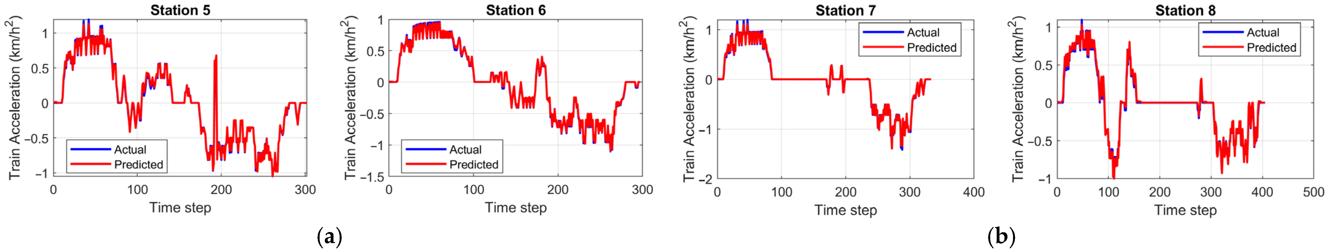 Stations 5–8 provide the generalization of the model across varying acceleration magnitudes and temporal patterns. Station 5 displays aggressive train dynamics with initial acceleration exceeding 1.0 km/h2, followed by complex oscillations, while the prediction of the model can follow throughout the challenging sequences. Station 6 demonstrates accurate prediction across the moderate magnitude operation with the successful capture of both powering and braking phase transitions. Station 7 presents a clear operation from cruising to braking conditions, where predictions show exceptional accuracy throughout either zero or non-zero acceleration periods. Station 8 shows the dynamics between the powering and braking conditions in about 0–150-time steps, with accurate predictions. Therefore, the model successfully passes the robustness of the prediction consistency across varying operational conditions.