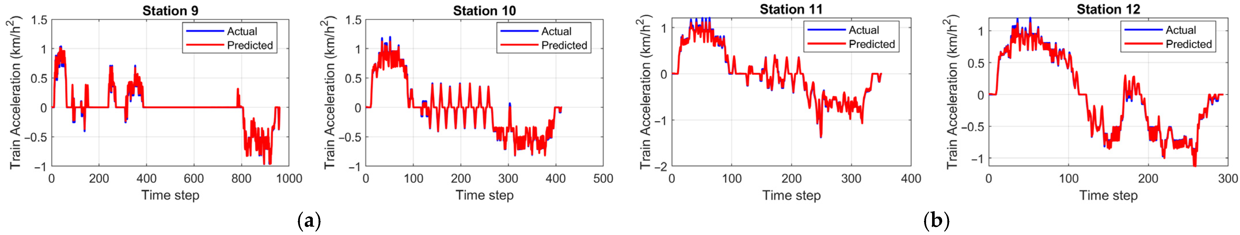 Station 9 presents the longest operational distance with about 1000 time steps, followed by a long period of near-zero cruising (time steps 400~800), where the model accurately maintains stability without drift. Even though Station 10 exhibits significant oscillations, the model can predict precisely every sequence across the transition from powering to braking. Stations 11 and 12 display different dynamics and multiple-phase transition, where predictions demonstrate strong accuracy, proving the robustness of the model.