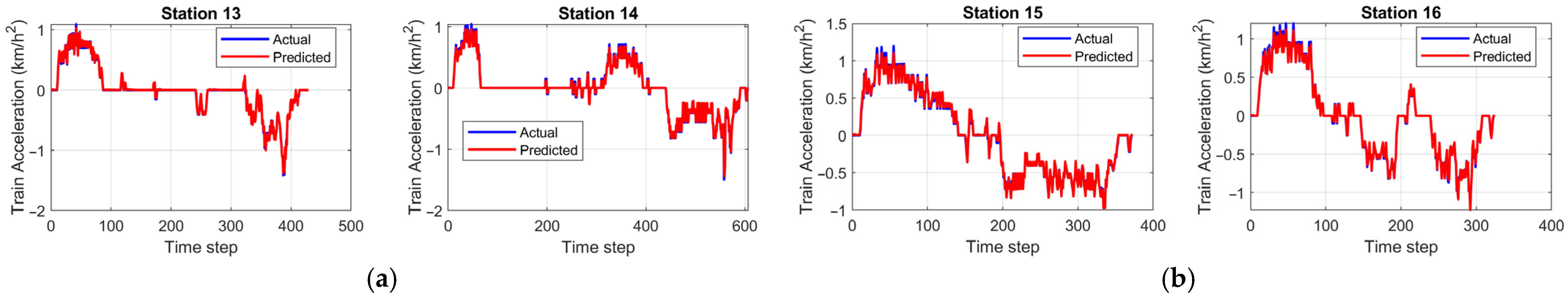 Stations 13 and 14 present complex deceleration patterns reaching about −1.5 km/h2, where the prediction of the model maintains close alignment throughout the rapid transitions. Station 15 starts with the initial acceleration peaks around 1.2 km/h2 and is then followed by the gradual deceleration and sustained negative acceleration phases. The model can demonstrate strong fidelity across the complete operation. Station 16 concludes the analysis with moderate acceleration dynamics with several transition phases. This confirms that the predictions of the model are consistent across all 16 track sections.