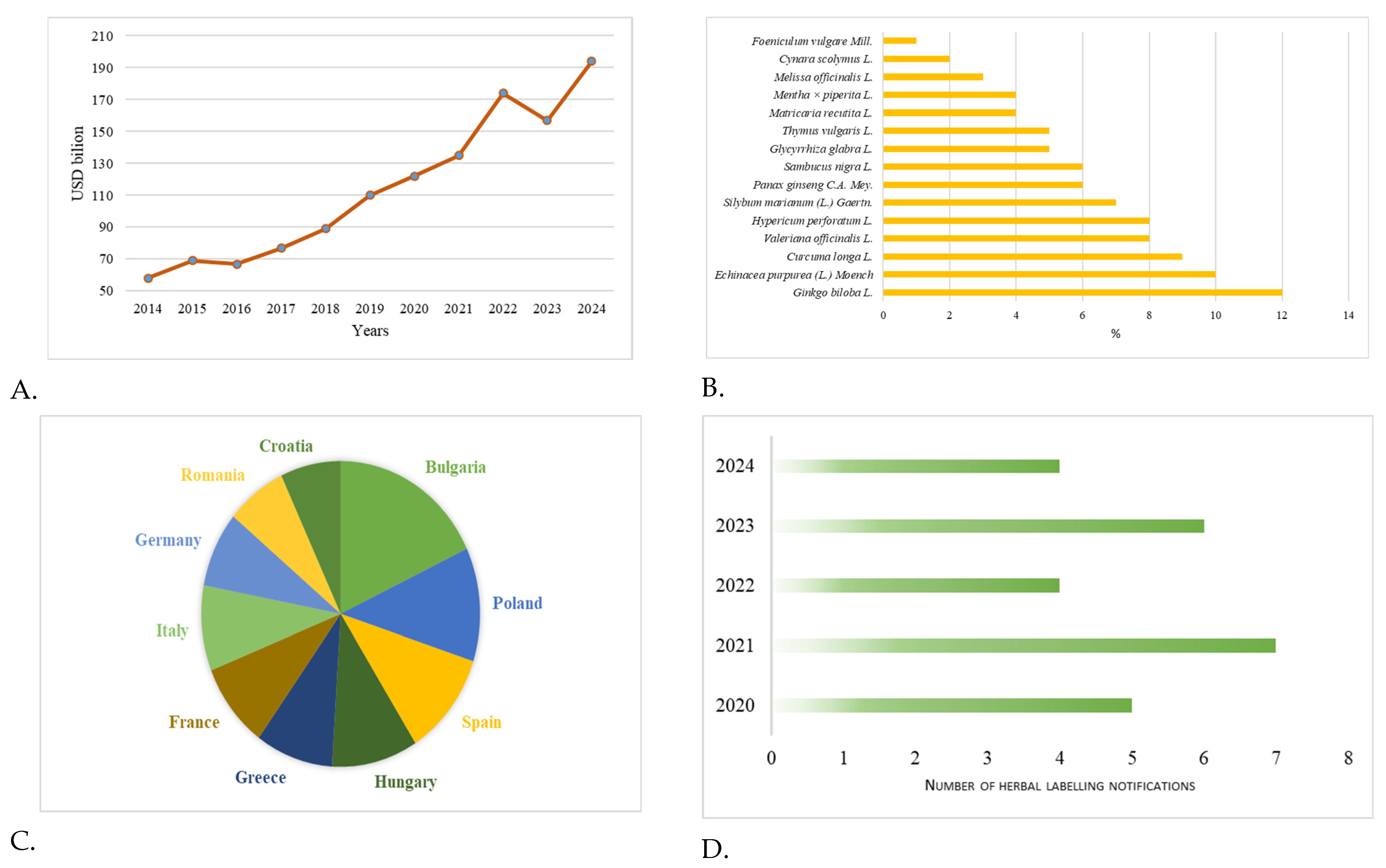 - Bhattacharjee, B.; Sandhanam, K.; Ghose, S.; Barman, D.; Sahu, R.K. Market overview of herbal medicines for lifestyle diseases. In Role of Herbal Medicines: Management of Lifestyle Diseases; Springer: Berlin/Heidelberg, Germany, 2024; pp. 597–614. [Google Scholar]