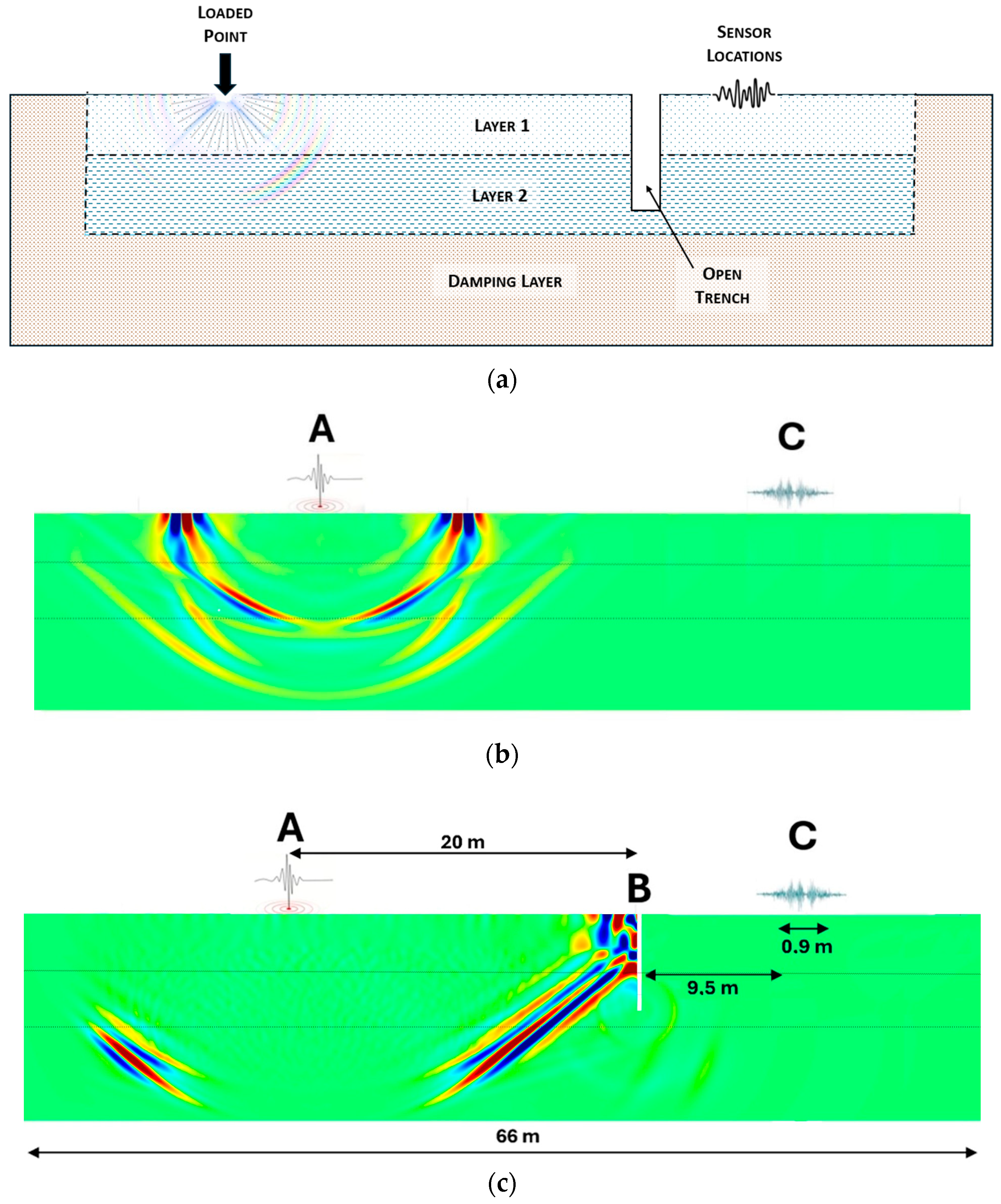 The impact point is 20 m to the left of the trench (which is 6 m deep and 0.36 m thick). Ten surface sensors recorded vibrational levels with and without the trench, positioned approximately 9.5 to 10.4 m to the right of the trench (with 10 cm spacing), as shown in Figure 1c. Figure 1b demonstrates an example of a simulation without the trench.