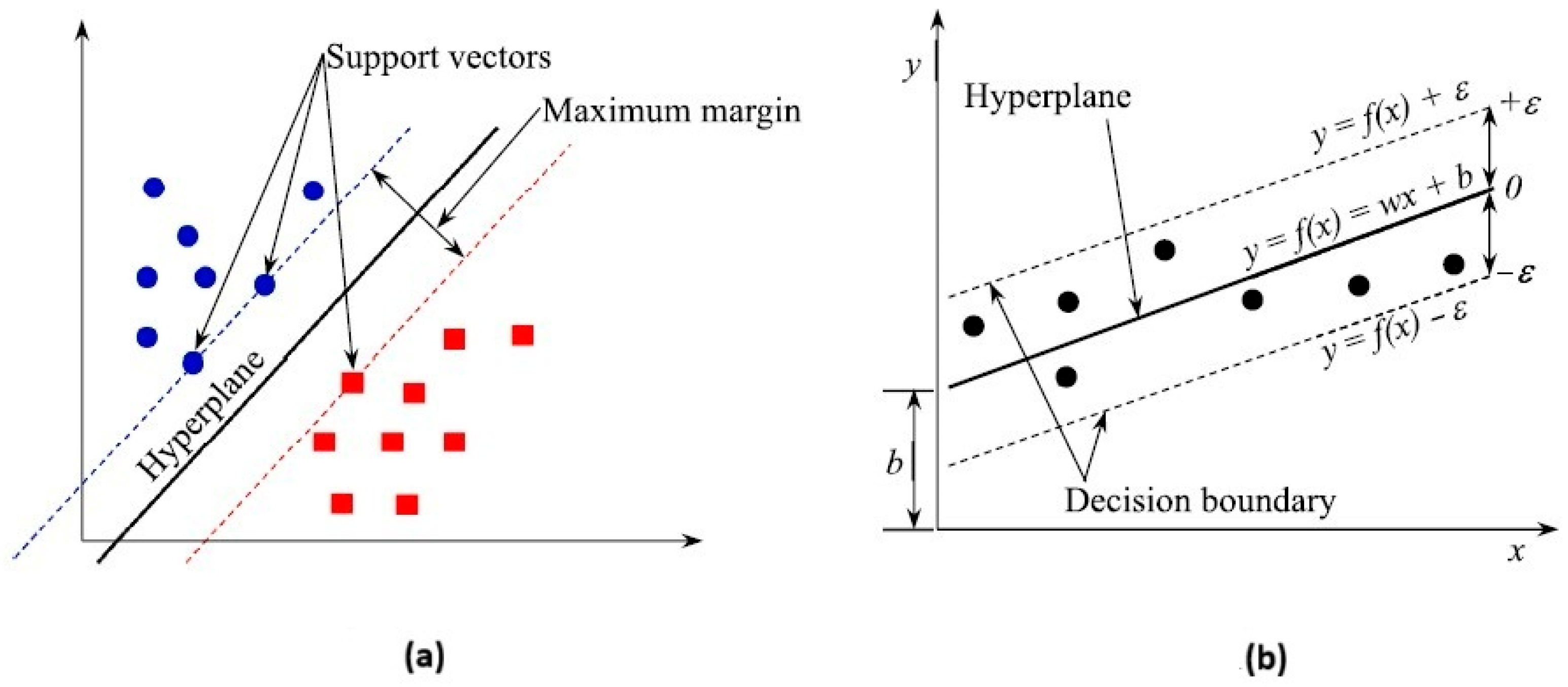 Support Vector Machines (SVM) is a widely used ML technique since the work of Boser et al. [48,49,50], which introduced it for classification problems. During that decade, it rapidly evolved and expanded its application scope, being nowadays applied in both classification and regression tasks, due to its accuracy and simplicity. The main concept in this algorithm is to find a way to separate groups of data features (vectors), finding an optimal separating hyperplane with the maximum distance between support vectors of the groups of data features. The data points located on the periphery of the data group are designated support vectors and influence the position and orientation of the hyperplane [18]. SVMs are effective even with small training datasets, though non-linear factors may be required to separate points that cannot be divided by a simple hyperplane, a process known as Kernel machines [18,48,49]. Figure 4 shows a diagram representing a SVM for classification and regression.