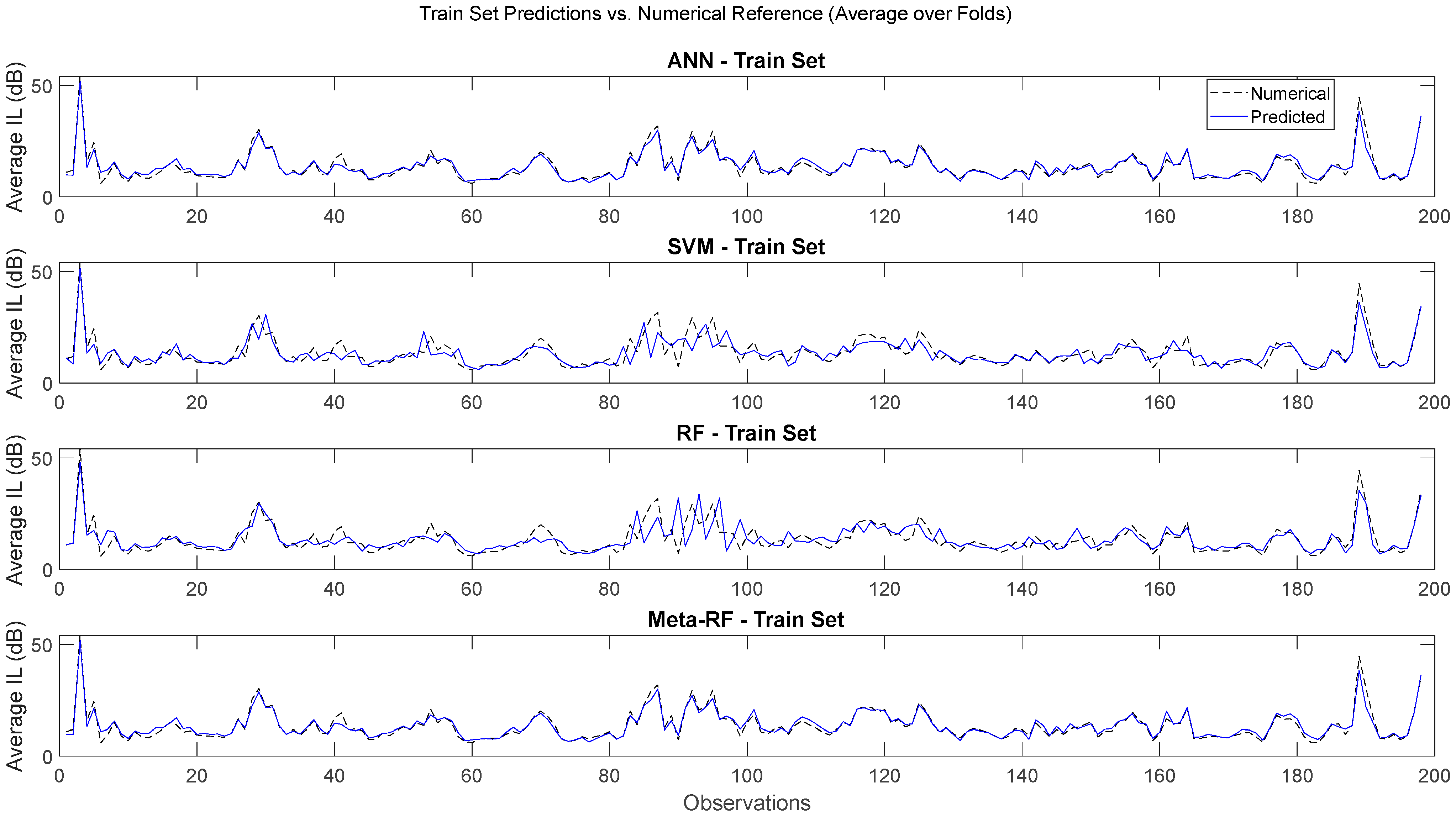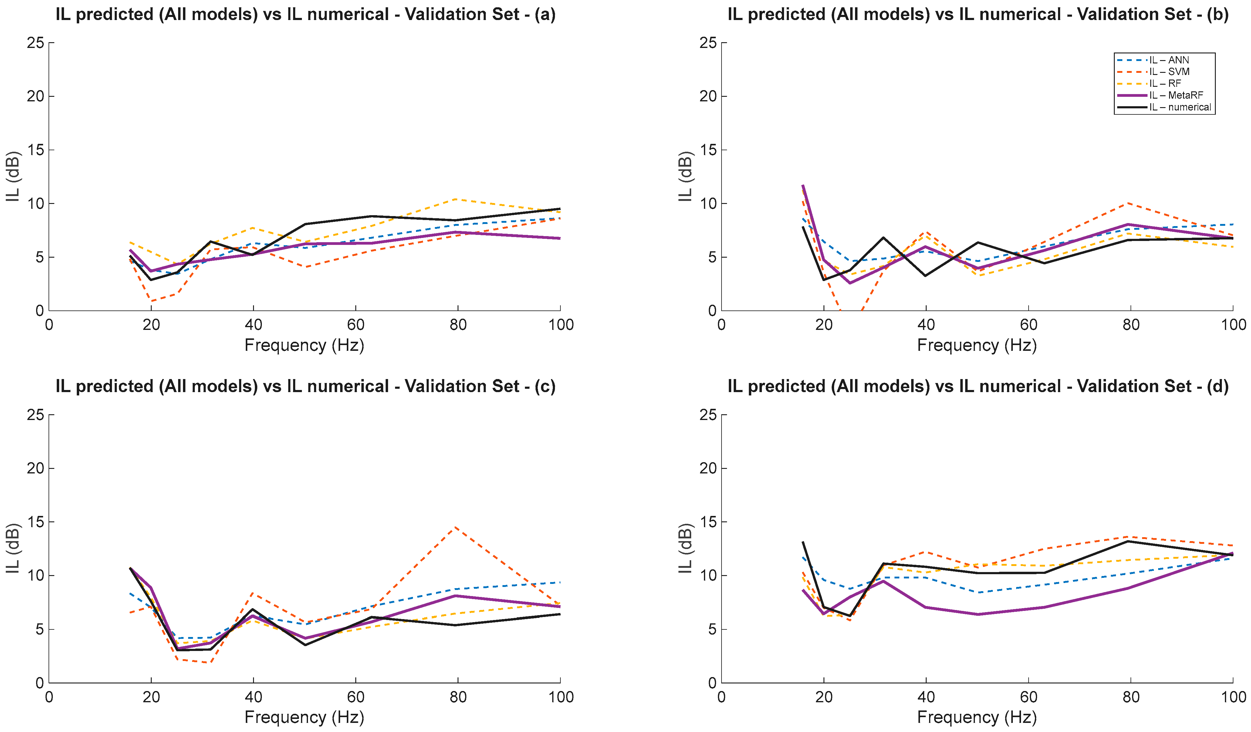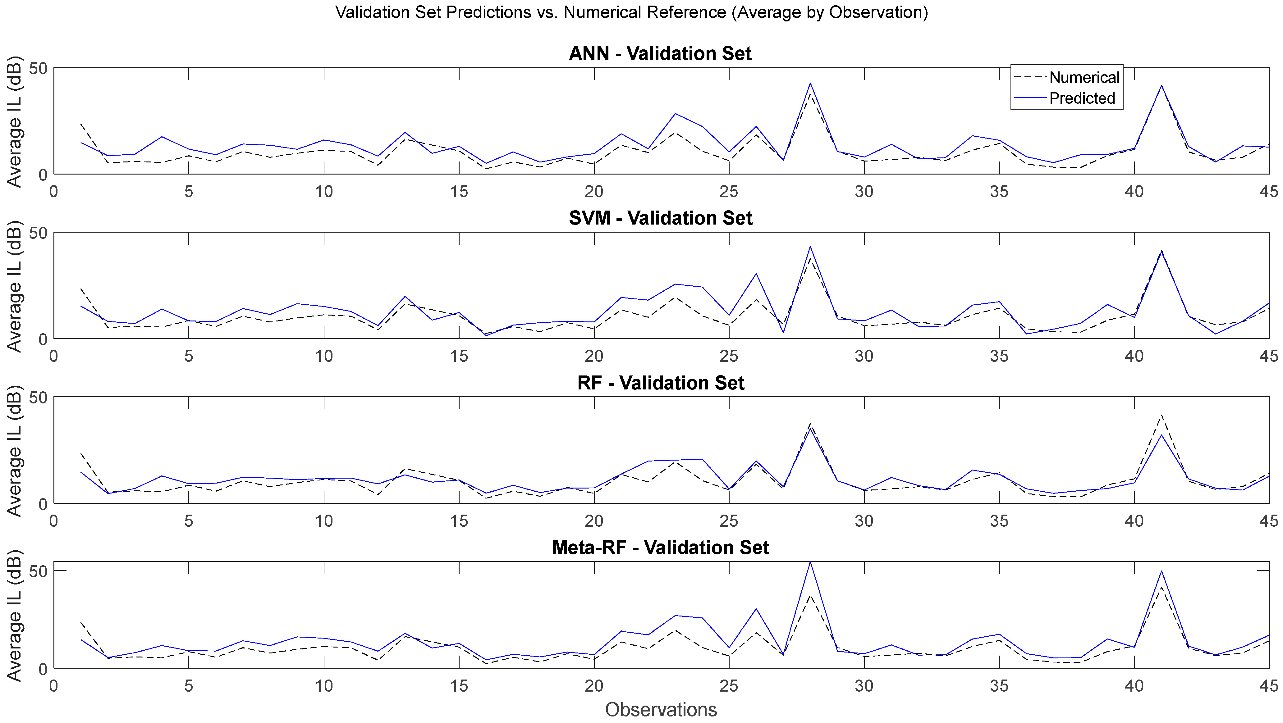 In this study, the application of different machine learning strategies—ANN, SVM, and RF—was motivated by their complementary characteristics in learning complex, non-linear mappings between input features (geometrical, physical, and elastic parameters) and insertion loss (IL) values across 11 frequency bands. Artificial neural networks (ANN) are particularly effective in approximating highly non-linear functions due to their layered structure and learning capacity. Support vector machines (SVM), on the other hand, perform well in high-dimensional spaces and are robust against overfitting in problems with limited training samples. Random forests (RF) offer interpretability and are less sensitive to parameter tuning, leveraging ensemble learning internally through decision tree aggregation. Each of these methods, however, presents specific biases or generalization limitations when employed individually. To address these shortcomings, an ensemble model was developed, synthesizing the predictions from the three approaches to enhance both accuracy and robustness. This ensemble acts as a meta-learner, effectively merging the distinct advantages of each method to provide a more stable and broadly applicable solution for predicting IL across various configurations.