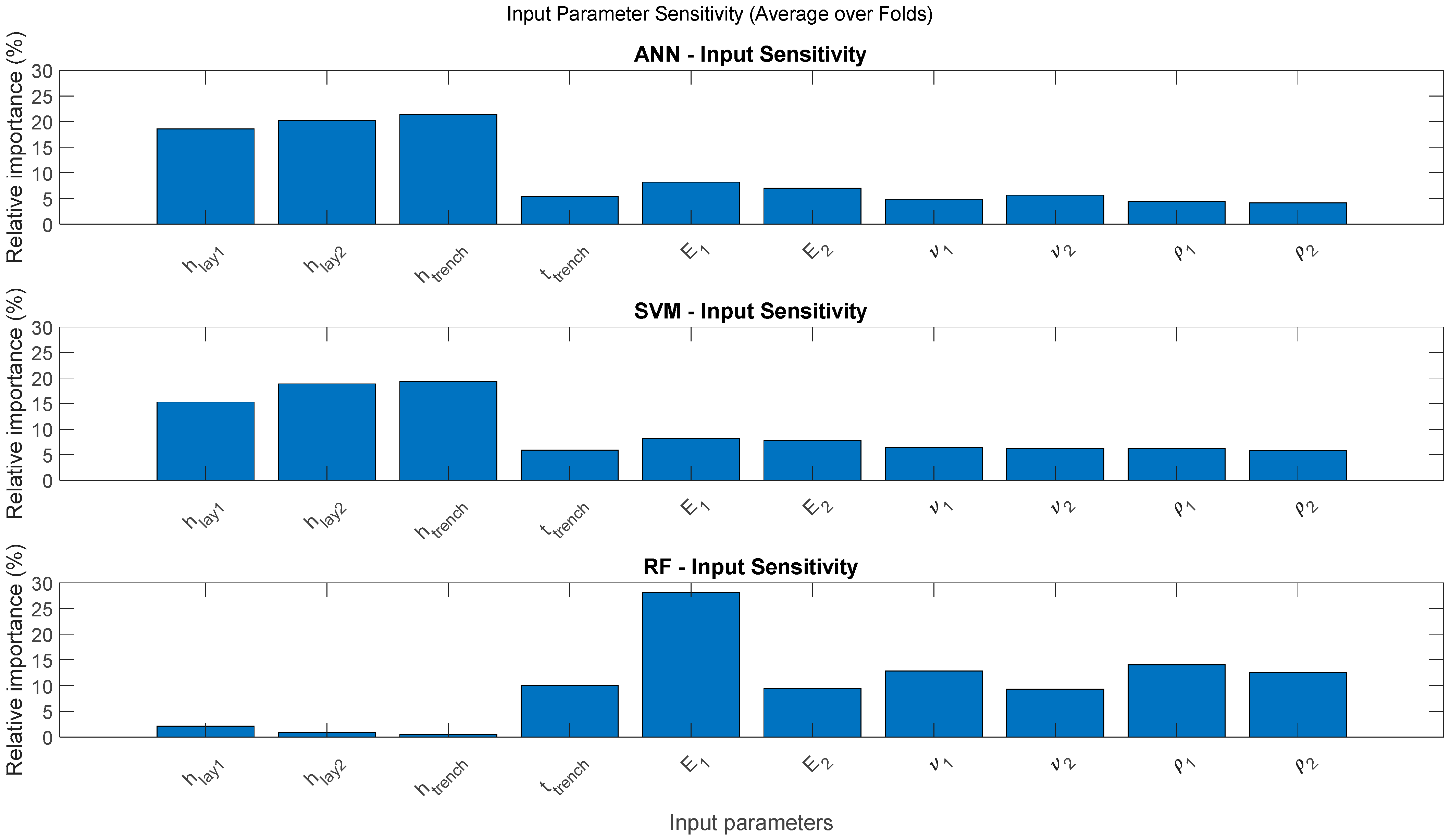 The workflow followed in this study for the application of machine learning algorithms is outlined in Figure 2a. The same procedure was applied independently to three different models: Artificial Neural Networks (ANN), Support Vector Machines (SVM), and Random Forests (RF). Each model was trained using the same set of input features and target values, and their performances were evaluated separately before combining their predictions in an ensemble model. The input parameter set for the machine learning models was carefully selected to include ten primary geometric and material properties: the thicknesses of both layers (hlay1 and hlay2), the depth and thickness of the open trench (htrench and ttrench respectively), the Young’s Modulus, the density and Poisson coefficient of both layers (E1, E2, ρ 1, ρ 2, ν1, and ν2 respectively). A more detailed schematic of the modeling process—including preprocessing, training, evaluation, and sensitivity analysis is presented in Figure 2b. This unified approach ensures methodological consistency across all models and facilitates direct comparison.