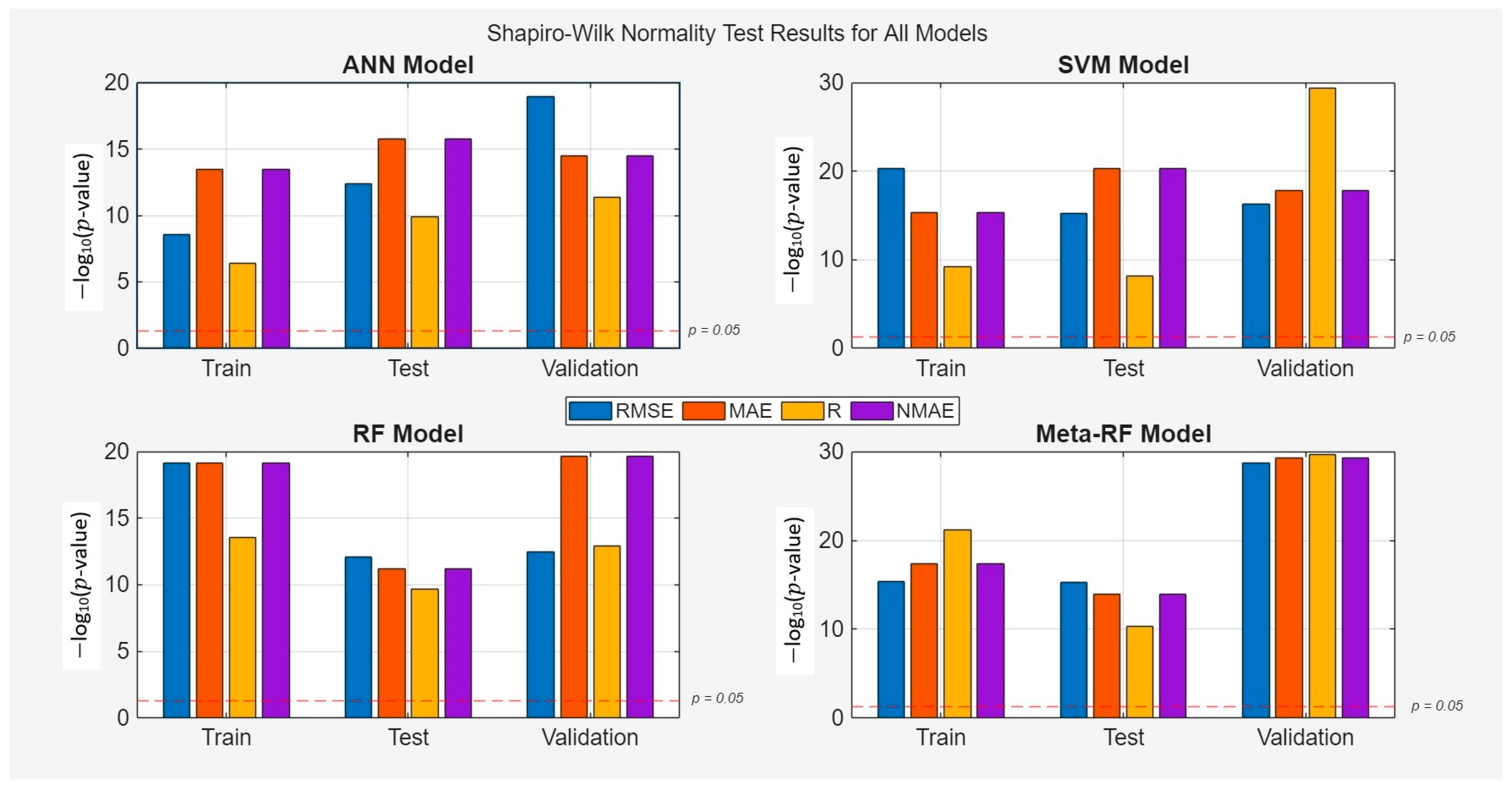 First, the Shapiro–Wilk test was applied to the distribution of performance metric values (RMSE, MAE, NMAE and R) across cross-validation folds, which is fundamental for understanding their statistical properties and guiding the choice of subsequent inferential methods (Equation (7)).