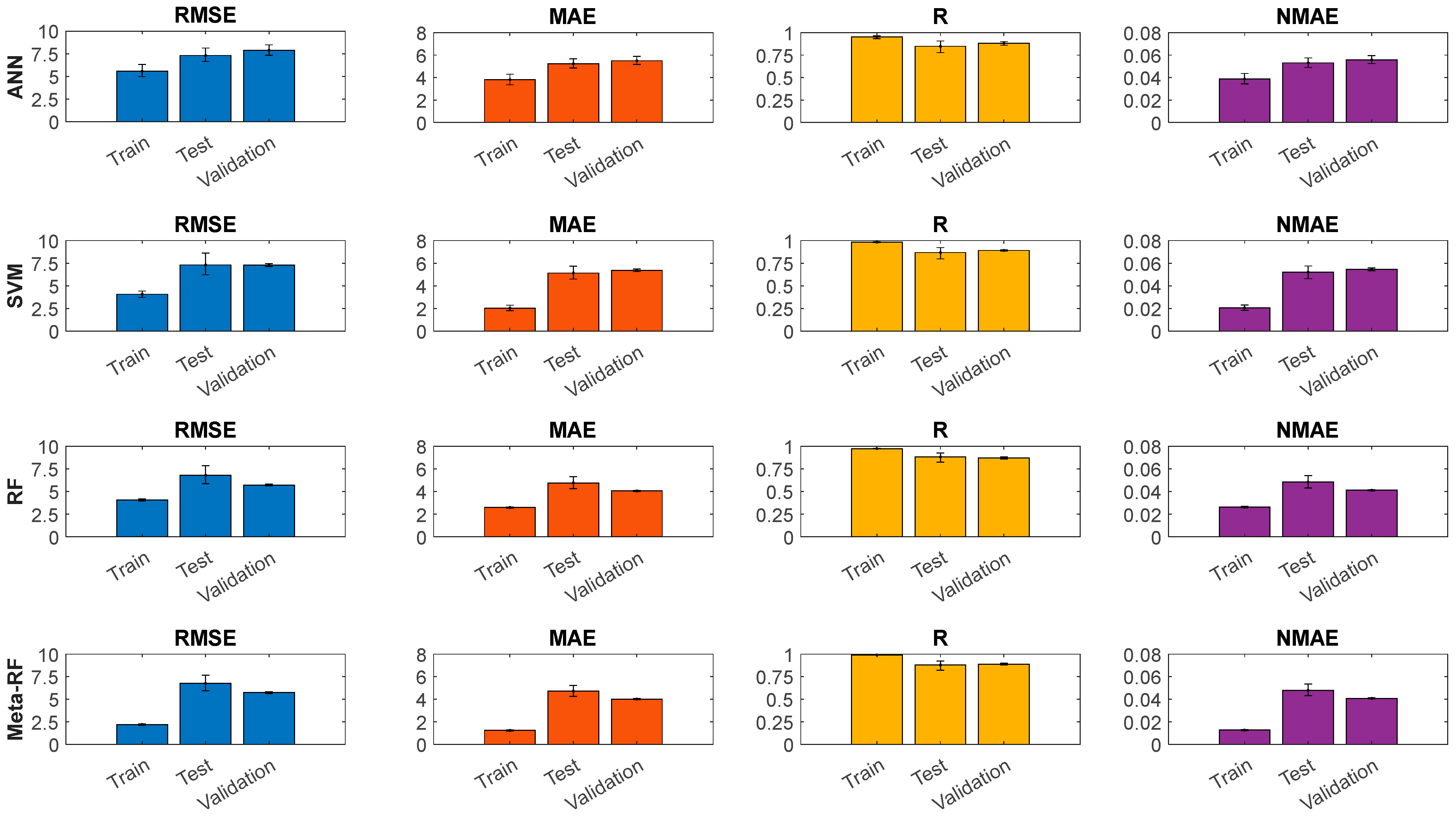 Figure 13. Comparison of the performance metrics (RMSE, MAE, NMAE, and R) for the ANN, SVM, RF, and Meta-RF models, for the validation dataset.