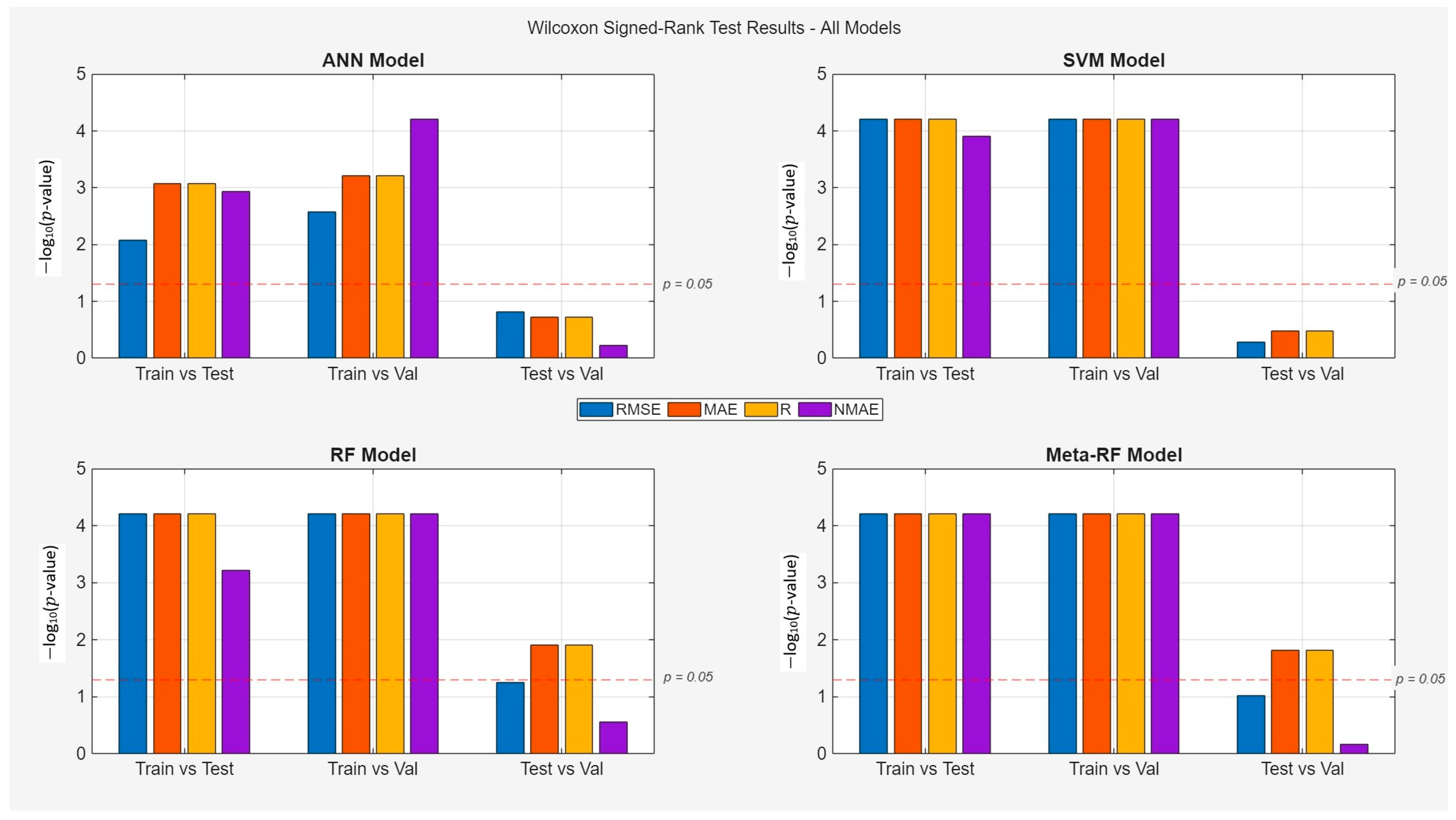 Finally, Wilcoxon signed-rank tests were applied to determine whether differences in model performance across the training, test, and validation sets were statistically significant. This non-parametric test is fundamental for assessing potential overfitting and validating the model’s generalization capability, especially when the assumption of normality or symmetry of differences cannot be met. It evaluates the null hypothesis that the median of the differences between paired observations is zero (Equation (9)).