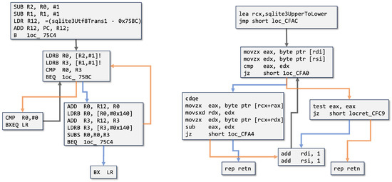 The function sqlite3StrICmp compiled under different platfroms (x64 on the left, arm32 on the right) results in starkly different graph structures, posing a challenge for matching.