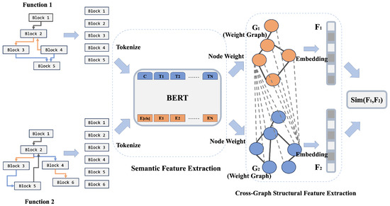 Representation of binary function. Some approaches directly represent binary functions using the raw binary byte stream, allowing the model to learn features autonomously [12,13,14]; some focus on structural features of binary code, including the structural characteristics of the binary function CFG [5,6,7] and the Abstract Syntax Tree (AST) [15,16]. During the transformation of functions into native binary bytes, it loses higher-level features such as semantics and call relationships, which can impact the model’s understanding of function functionality. As a structural feature, ASTs tend to emphasize semantic similarity and may not provide explicit control flow and data flow information. CFGs contain both function instruction information and can represent data dependency relationships between various blocks. Therefore, we believe that the CFG is the most suitable function representation for binary code similarity detection.