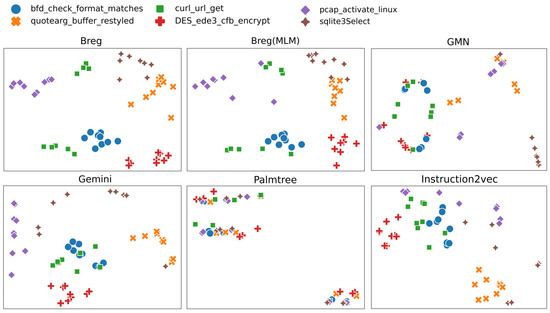 Visual representation evaluation assesses the model’s ability to retain source function information when generating function embeddings. We compile these six randomly chosen functions into nine different copies on arm32, mips32, and x86 platforms using gcc 7.0 with optimization levels O0, O1, and O2. We use T-Distributed Stochastic Neighbor Embedding (T-SNE) [22] to reduce the dimensionality of binary function embedding vectors to two-dimensional space. Figure 6 presents the results of the visualization standard evaluation, with the legend providing the names of the selected functions.