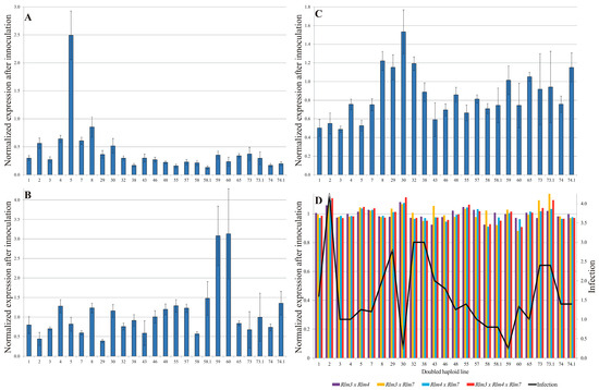 The highest relative expression level of the Rlm3 was observed with the oilseed rape DH line 5 (2.49 ± 0.43). In most of the cases, the fold change of the expressed gene did not exceed 0.5. A diversified change in the expression level of the genes Rlm4 and Rlm7 was observed. In the context of the Rlm4 gene, the lowest observed value for the gene expression fold change was 0.39 ± 0.04 in the DH line 29, while the highest value was recorded in DH line 60, with a fold change of 3.13 ± 1.15. With respect to the expression fold change of the Rlm7 gene, the lowest and highest values were recorded as 0.49 ± 0.04 and 1.53 ± 0.24, respectively, in DH lines 3 and 30 (Figure 1). Nevertheless, expression patterns of Rlm3, Rlm4 and Rlm7 across 25 DH lines were consistent (Figure 1D).