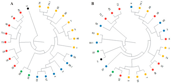 The phenotypic similarity of DH lines in terms of blackleg (Leptosphaeria spp.) resistance ranged from 0 (for 13 pairs of lines) to 1 (for two pairs of lines: DH2 0/21DH6747—no. 30 and DH2 0/21DH6732—no. 2 as well as DH2 0/21DH9450—no. 59 and DH2 0/21DH6732) (Table 2). A dendrogram showing phenotypic similarity among the 25 DH lines analyzed was constructed from phenotypic similarity coefficients using the UPGMA method of blackleg (Leptosphaeria spp.) resistance observations (Figure 2A). The dendrogram distinguished five similarity groups (Figure 2A). One group consisted of line no. 2. The second group consisted of eight lines numbered 43, 8, 46, 73.1, 73, 29, 38, and 32; the third group consisted of two lines: 59 and 30; the fourth group consisted of six lines (65, 57, 4, 3, 58.1, and 58); and the fifth group consisted of the remaining eight lines: 1, 48, 5, 7, 60, 55, 74.1, and 74 (Figure 2A).