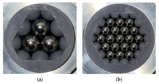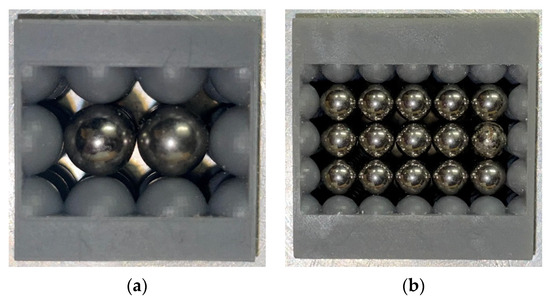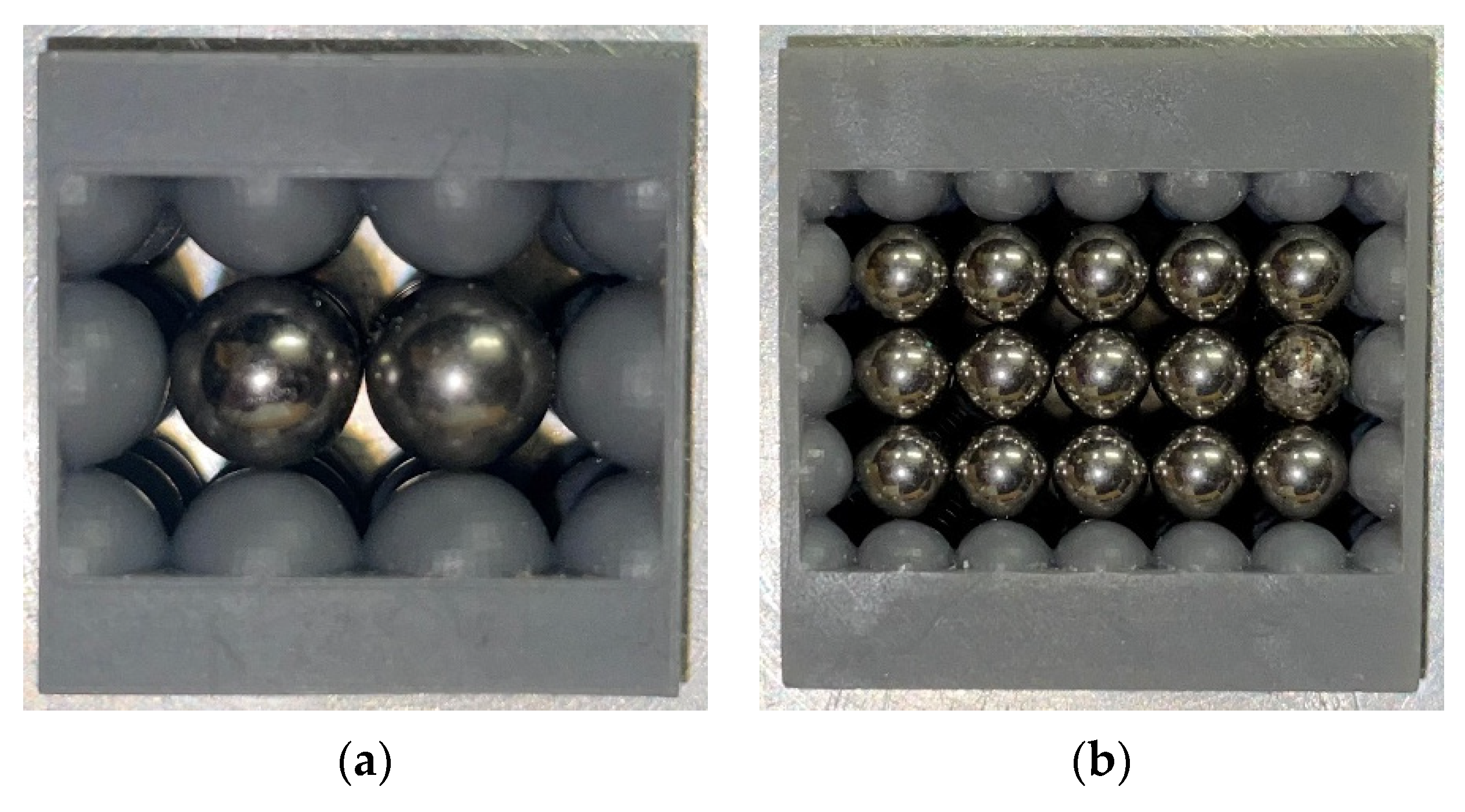 The sound absorption coefficients were measured for the hexagonal lattice, simple cubic lattice, and random packing structures. The measurement samples are shown in Figure 1, Figure 2 and Figure 3, and their specifications are in Table 1. Stainless steel spheres with grain sizes of 8 and 4 mm, respectively, were utilized as the hexagonal and simple cubic lattice samples (Figure 1 and Figure 2, respectively). For random packing, glass beads with grain sizes of 4, 2, 1, 0.8, 0.6, 0.5, 0.4, 0.3, 0.2, 0.1, and 0.05 mm were used. Three random packing samples with grain sizes of 4, 1, and 0.05 mm are shown in Figure 3.