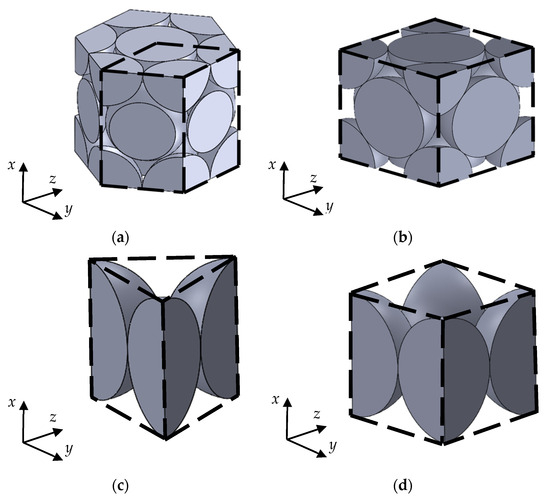 Analysis unit per regular packing structure: (a) hexagonal close-packed; (b) face-centered cubic; (c) hexagonal lattice; (d) simple cubic lattice.