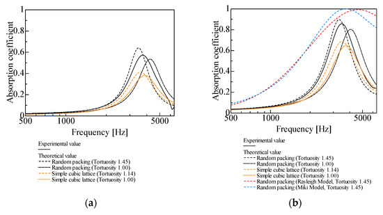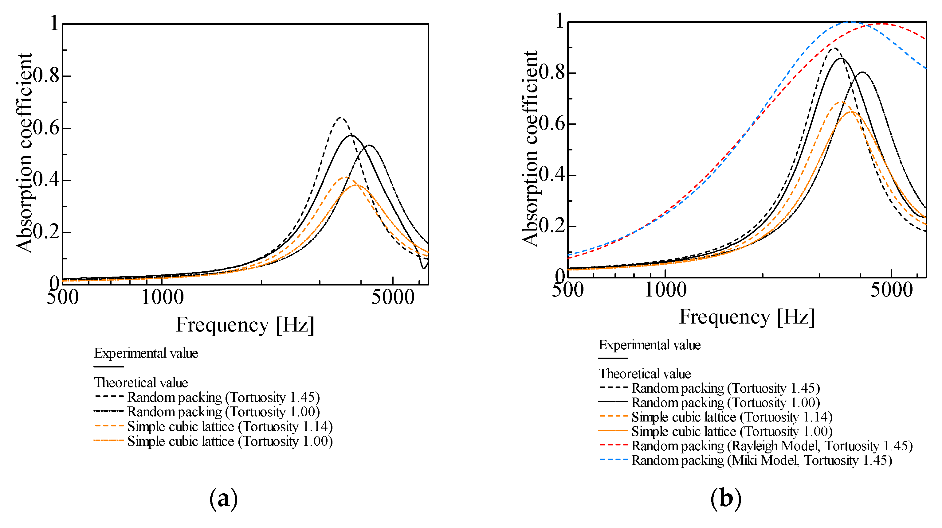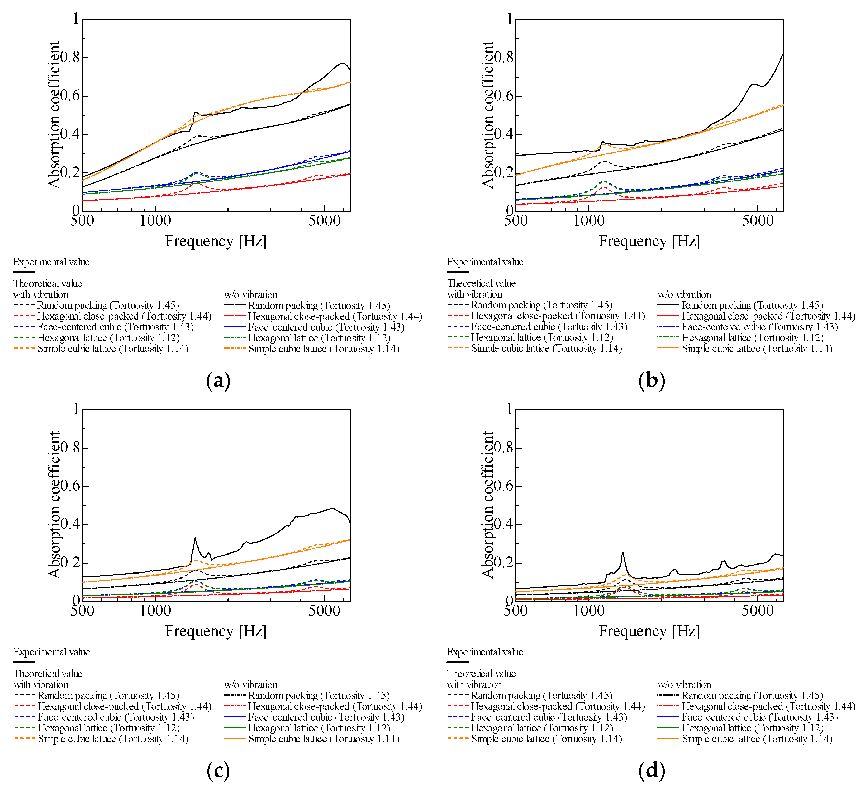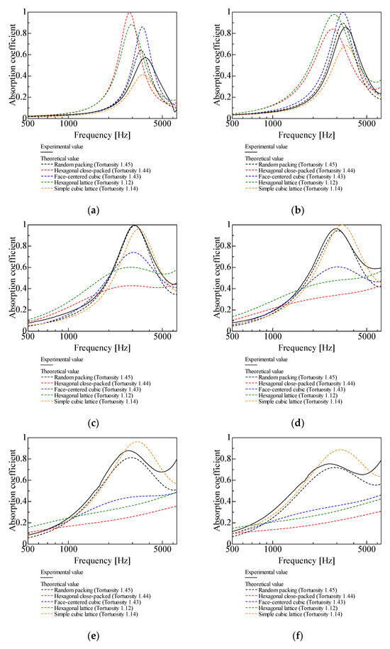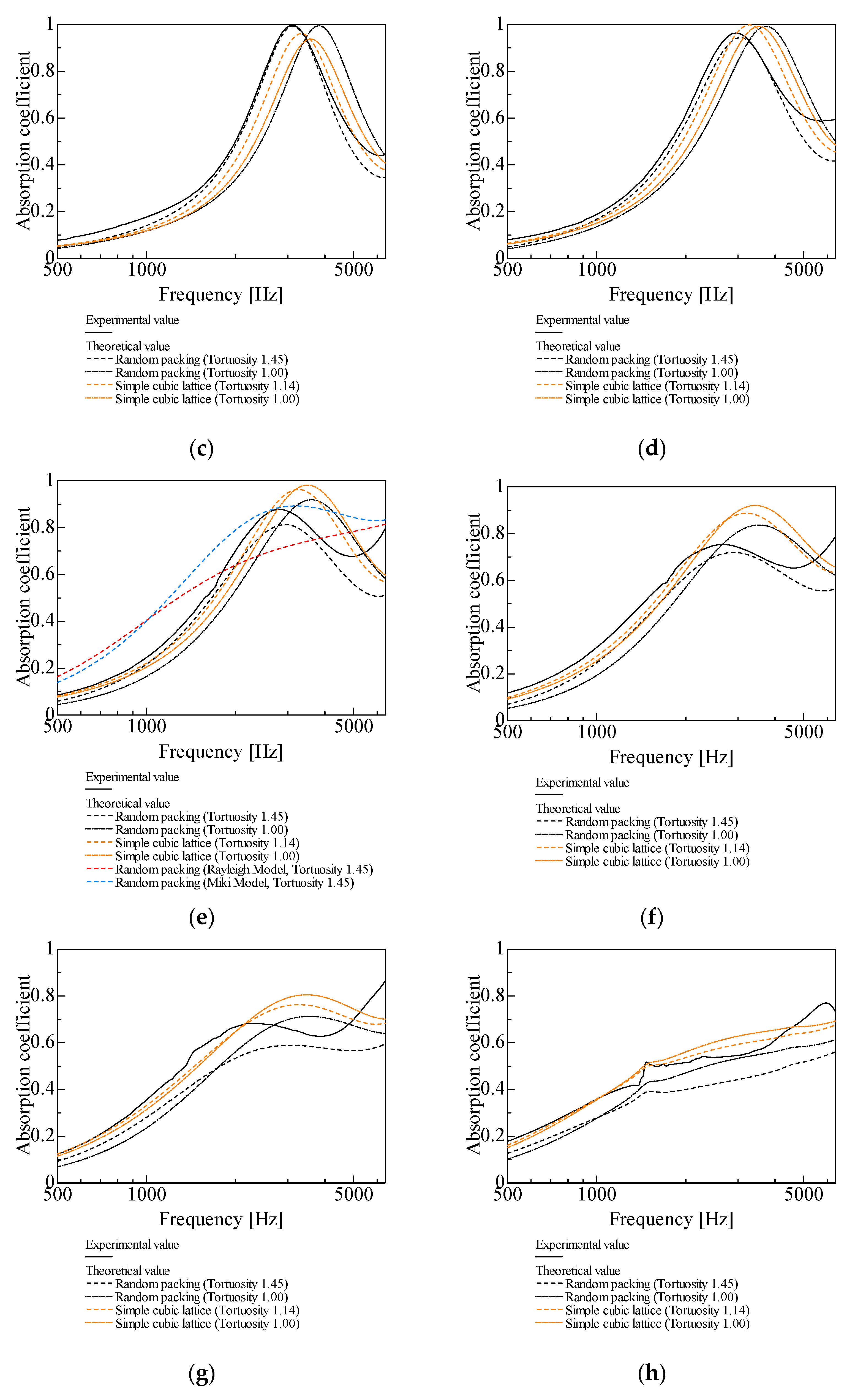In this section, the experimental and theoretical values of the normal-incident sound absorption coefficient are compared for samples with different packing structures and grain sizes. First, the validity of the experimentally determined tortuosity was examined for the case of regular packing structures. Figure 7a,b and Figure 8a,b show the comparisons for the hexagonal lattice and the simple cubic lattice, respectively, for d = 8 mm and d = 4 mm.