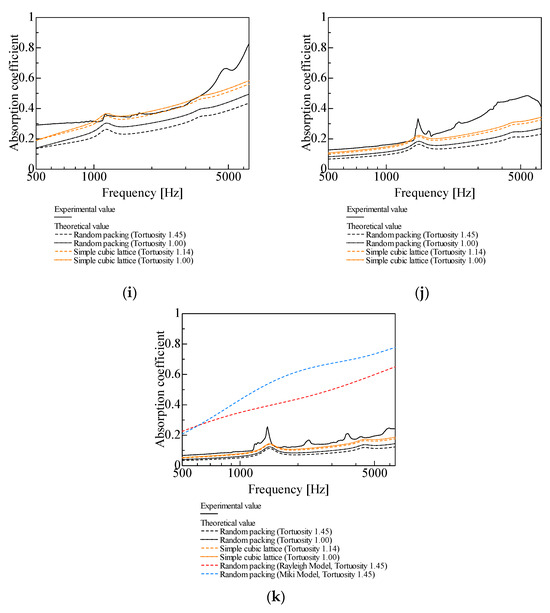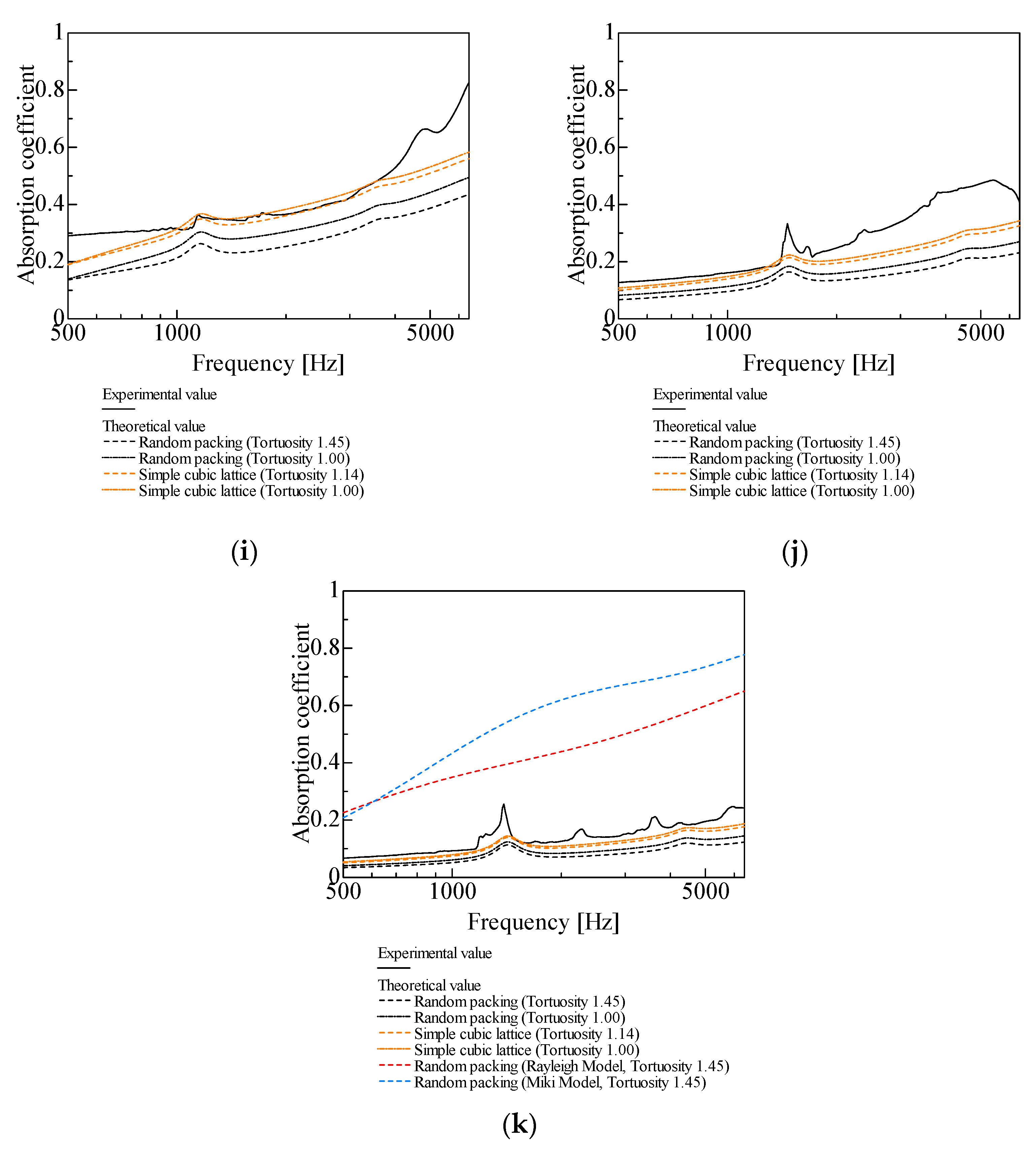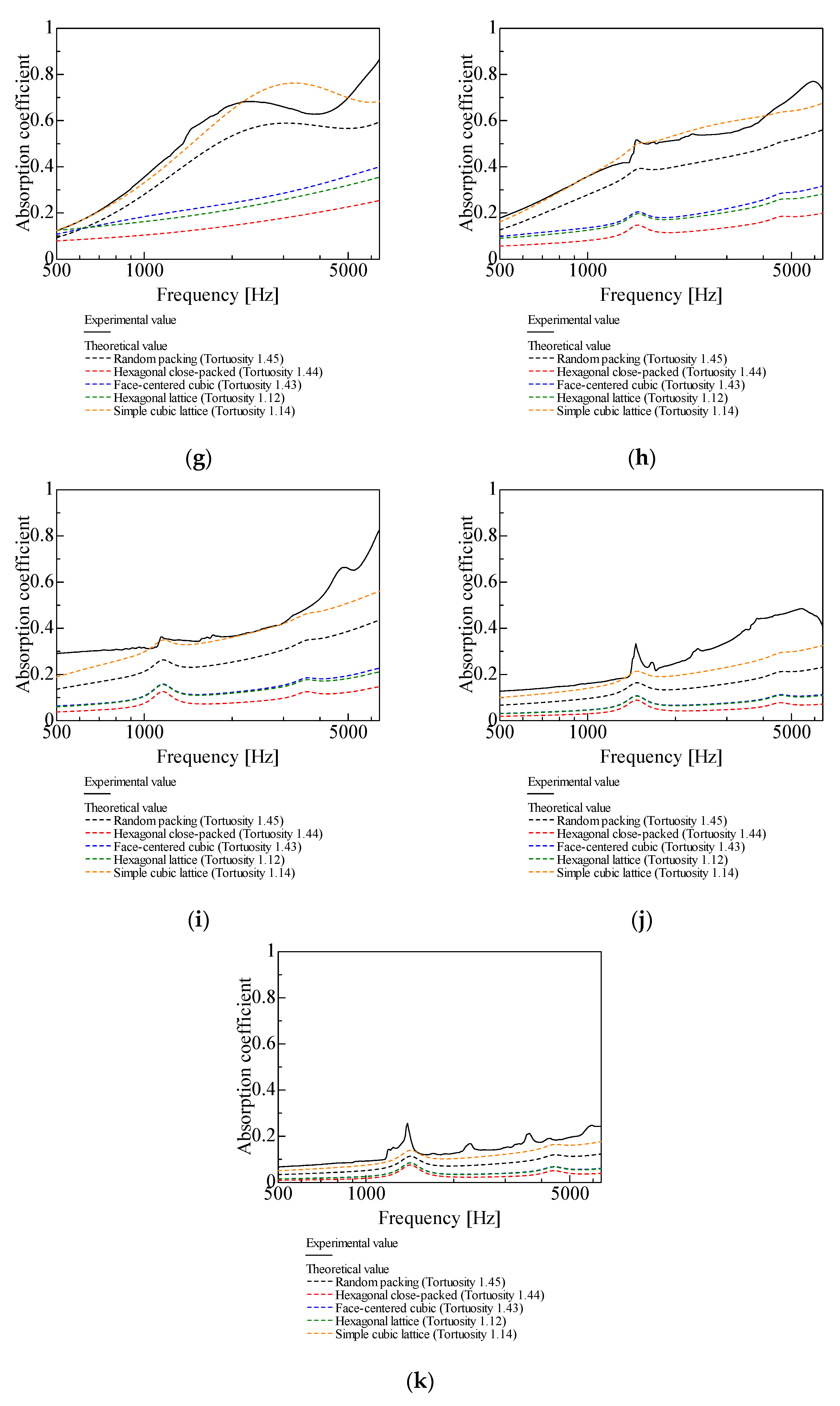 In this section, the experimental values of the normal-incident sound absorption coefficient for random packing with varying grain sizes are compared with the theoretical values for each packing structure. Figure 9a–k show a comparison of the experimental and theoretical values for d = 4–0.05 mm.