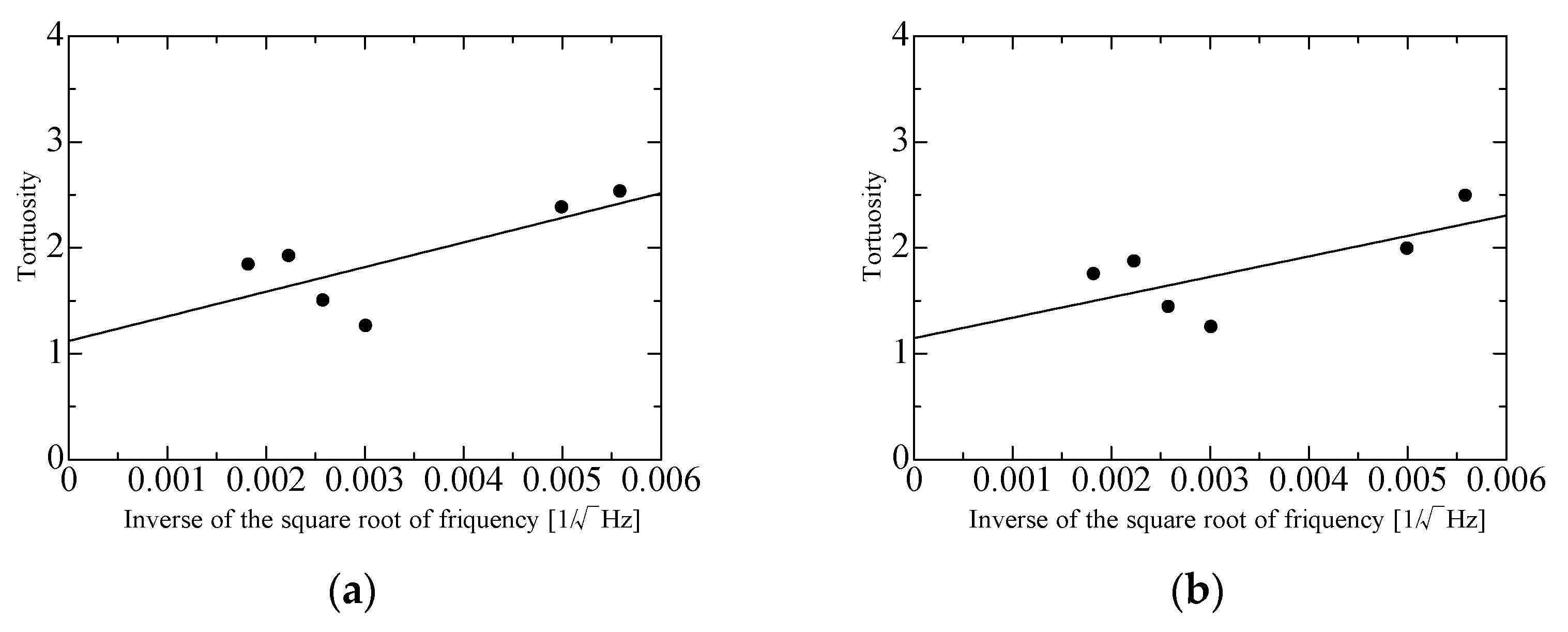 - Allard, J.F.; Castagnede, B.; Henry, M. Evaluation of tortuosity in acoustic porous materials saturated by air. Rev. Sci. Instrum. 1994, 65, 754–755. [Google Scholar] [CrossRef]
