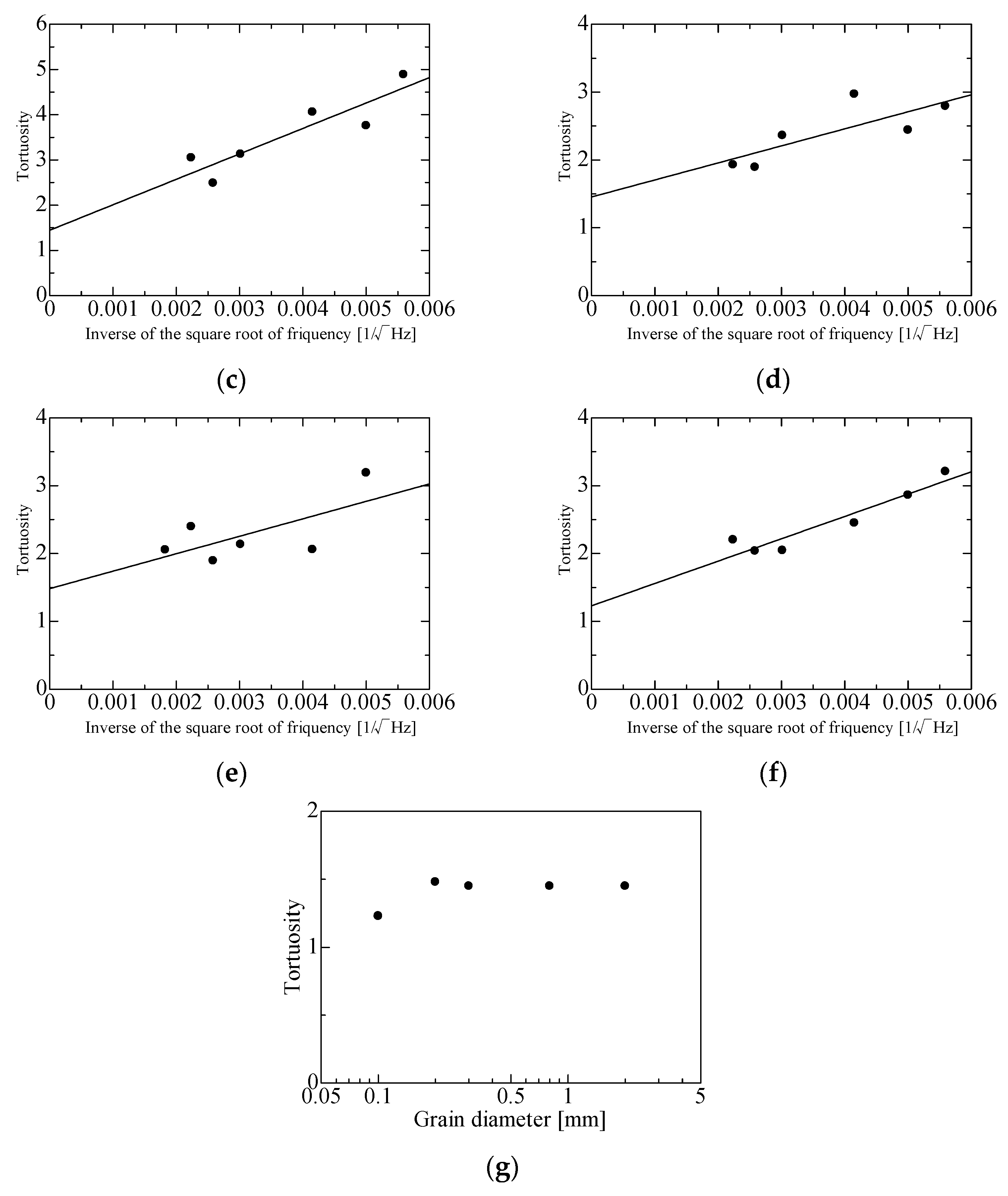 Figure 4g is a summary of the tortuosity results for the random packing samples with d = 2, 0.8, 0.3, 0.2, 0.1 mm. According to a previous study [15], “all the tortuosities are constant with the particle diameter. The average values for these constant tortuosities are α∞ = 1.437” [15]. In Figure 4g, the tortuosities of the random packing samples of varying grain sizes are concentrated around α∞ = 1.45, which is close to the previously reported value of 1.437 [15]. Therefore, α∞ = 1.45 at d = 2 mm [22] was used in this paper. (In Figure 4f, α∞ = 1.23 at d = 0.1 mm, but the low signal-to-noise [S/N] ratio of the measurement made it unreliable. Furthermore, the α∞ value for random packing with d = 0.05 mm was not measurable due to the low S/N ratio.)