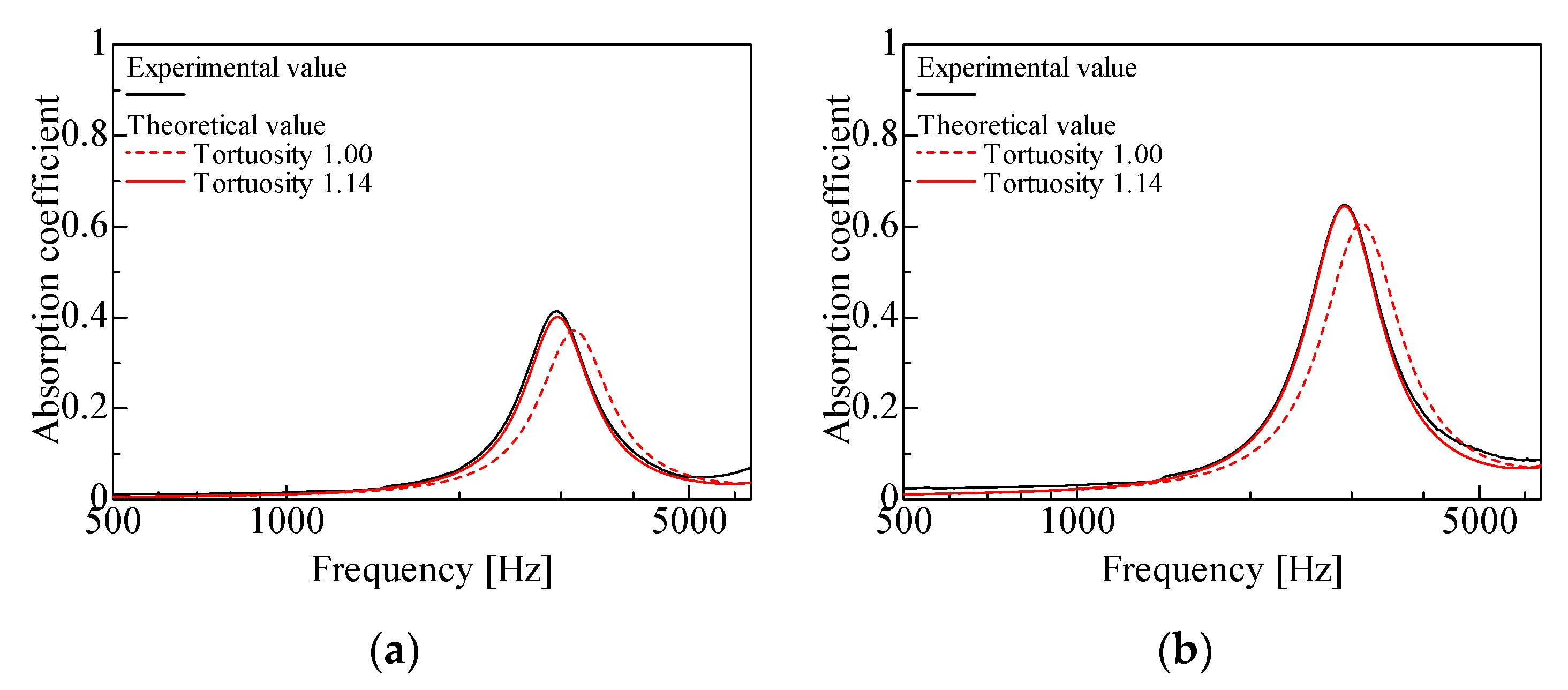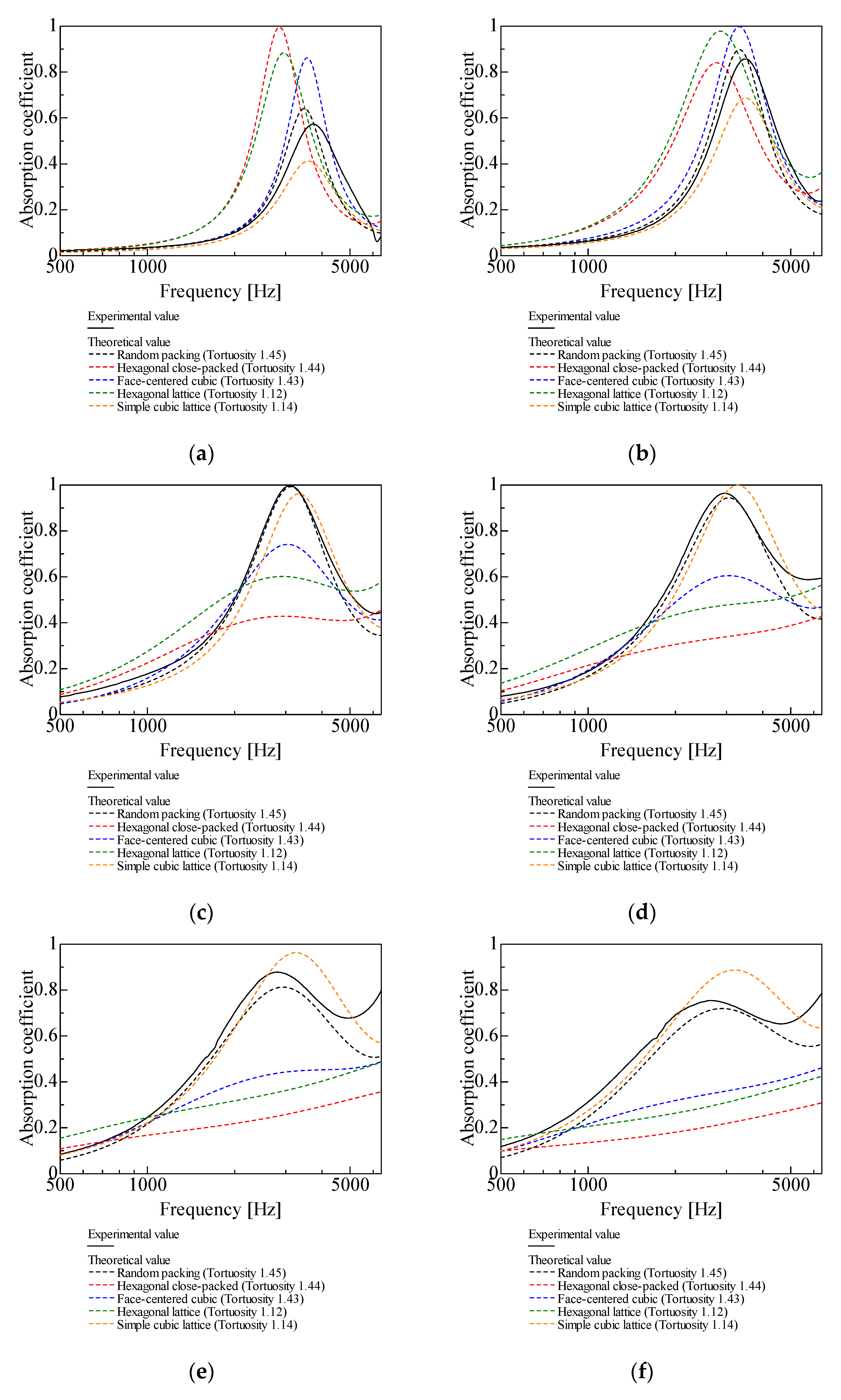 First, the experimental values are compared with the theoretical values without considering tortuosity. In all cases in Figure 7 and Figure 8, the theoretical values consistently shifted toward higher frequencies compared with the peak frequencies of the experimental values. In all cases, the theoretical values had lower peak sound absorption values than the experimental values.