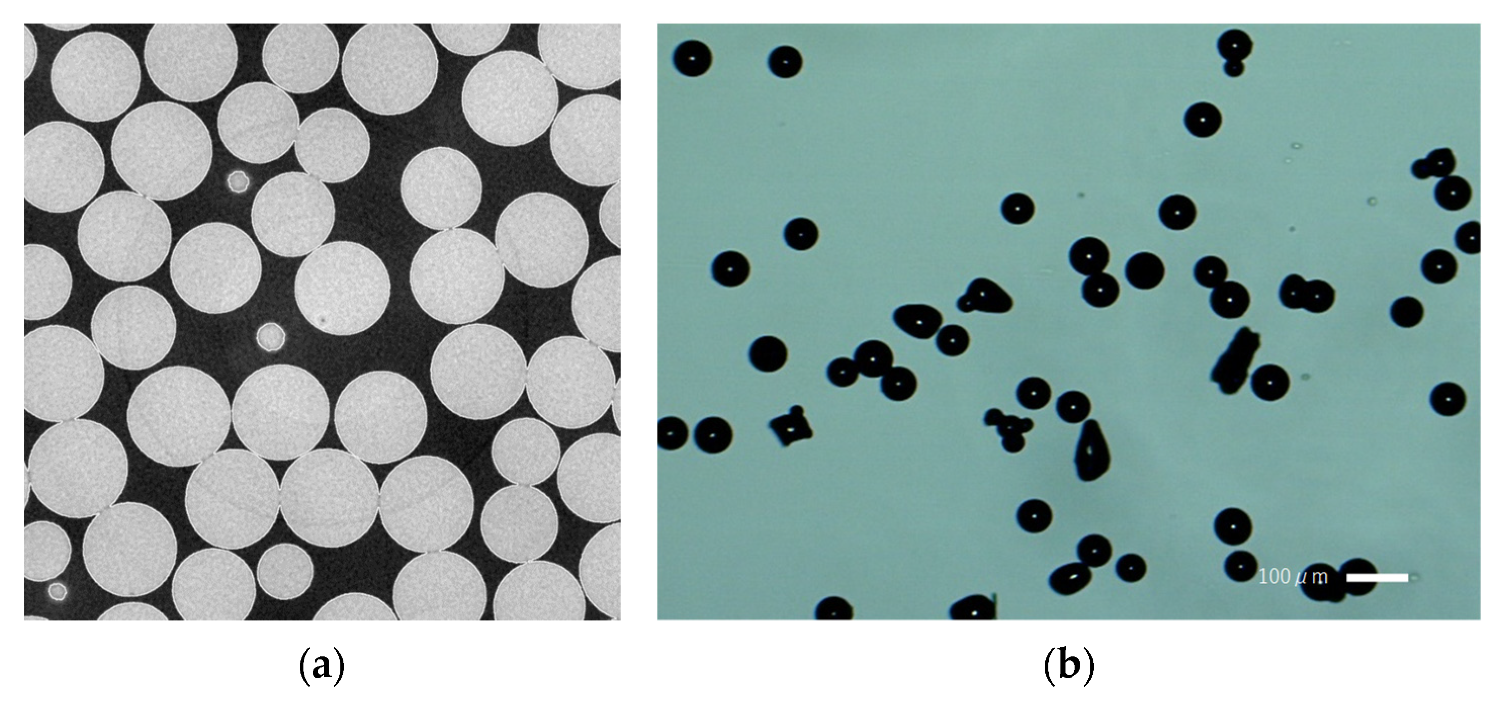 In Figure 9d–k (d = 0.8 mm and smaller), the difference between the theoretical and experimental values for random packing increases as the grain size decreases, possibly due to the difference between the actual glass beads and the CT images used for the theoretical analysis. Figure 10a shows a CT image of the d = 2 mm glass beads used in the theoretical analysis for random packing, and Figure 10b shows a microscopic image of d = 0.05 mm glass beads separated by gaps, captured at 40× magnification. Each cross-section of a d = 2 mm glass bead is almost a perfect circle in the CT image (Figure 10a), indicating that the particles are spherical. However, in Figure 10b, many of the d = 0.05 mm glass beads have distorted shapes and different sizes. (Visual observation confirmed the presence of fewer distorted glass beads at d = 1 mm or larger.) Therefore, the proportion of distorted glass beads increases as the grain size decreases. However, the distorted particles were difficult to isolate visually or remove by sieving because of their large number at small grain sizes. This may be one of the reasons for the difference between the theoretical and experimental values for random packing with a decrease in grain size.