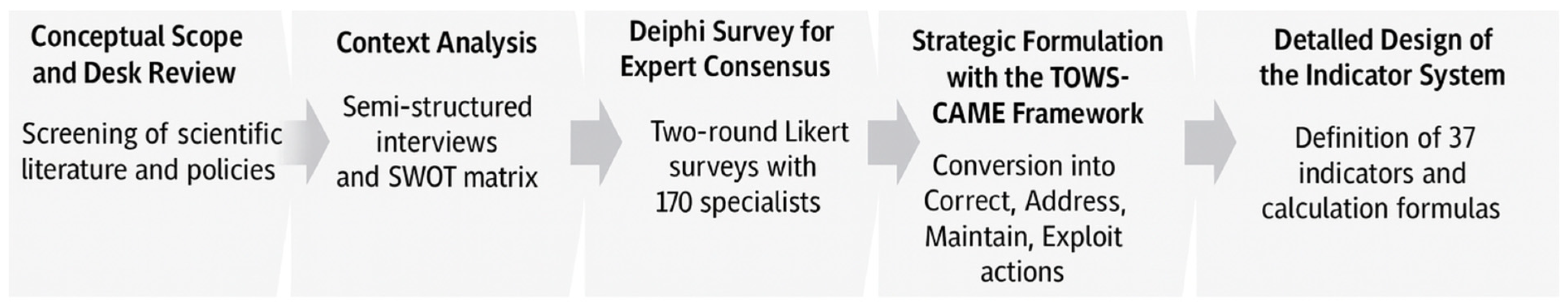 The validation protocol combined quantitative and qualitative procedures. A panel of 170 experts from education, engineering, architecture, and public administration scored each metric on a five-point Likert scale for clarity, relevance, and feasibility; content-validity indices equal to or above 0.80 confirmed conceptual robustness.