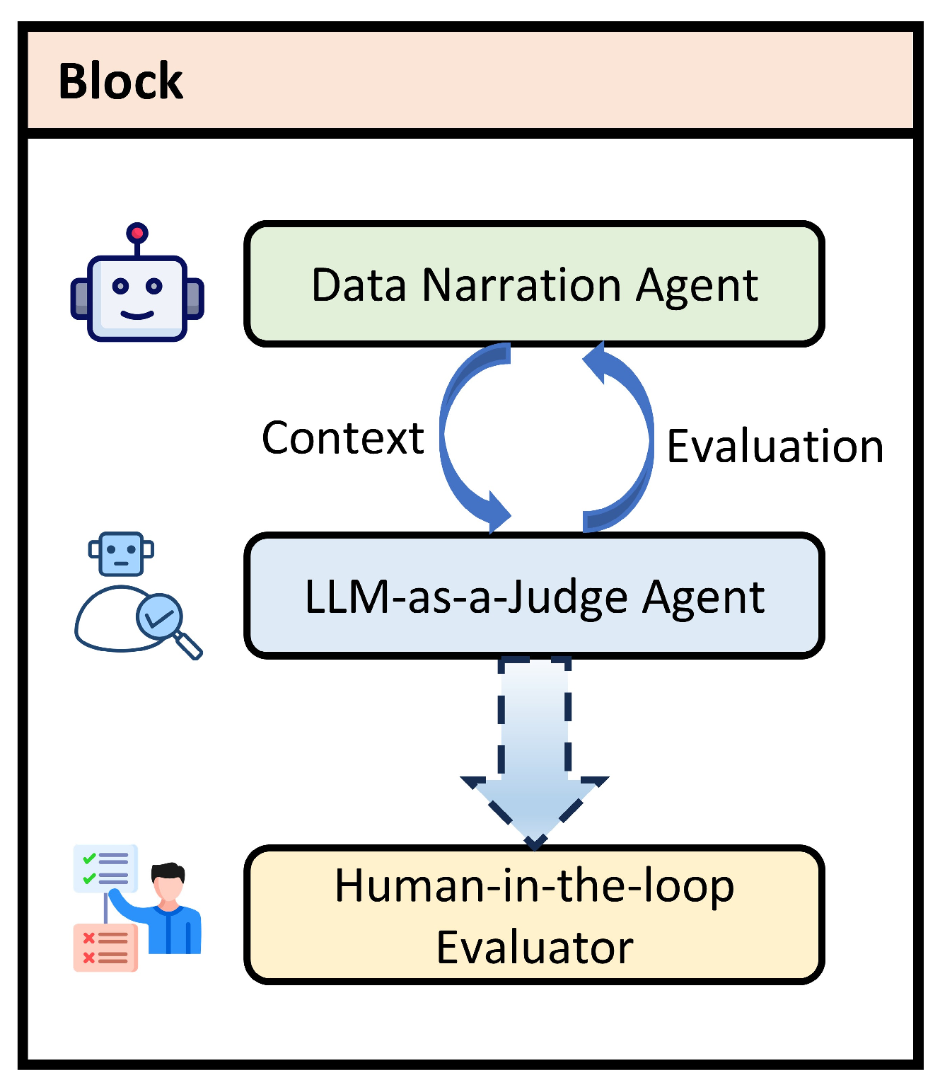 The data narration agent is responsible for processing multimodal inputs such as charts, tables, and numerical results, and transforming them into coherent, context-aware textual narratives with an LLM. The LLM-as-a-judge agent then assesses the generated narratives for quality, internal consistency, and alignment with the intended analytical objectives. To enhance the reliability and domain relevance of the outputs, an optional human-in-the-loop evaluator is included. This agent provides expert oversight and enables the validation or refinement of the machine-generated narratives in applications that require domain-specific sensitivity.