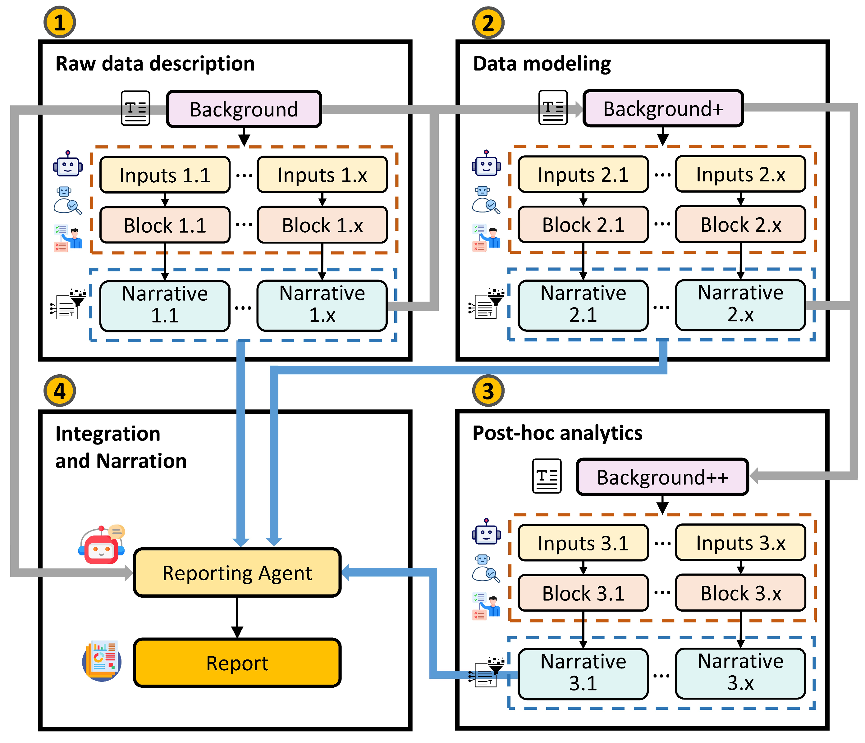 As illustrated in Figure 2, the framework proceeds through four connected stages: raw-data description, data modeling, post hoc analytics, and integration and narration. The contextual knowledge in each subsequent stage builds cumulatively, incorporating both the background from the preceding stages and the narrative outputs generated at those stages. For instance, the “Background+” in Stage 2 integrates the “Background” in Stage 1 along with Narrative 1.1–1.x.