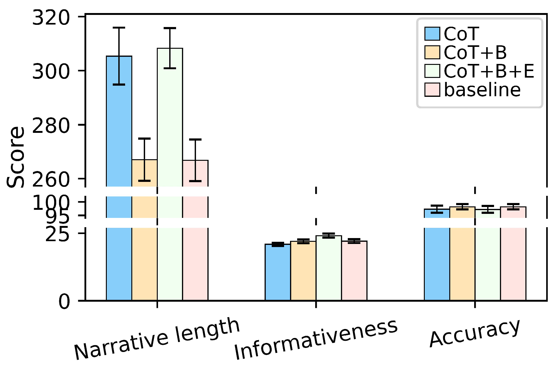 Figure 3. The evaluation scores of ablation studies. The x-axis indicates the evaluation criteria, the y-axis reflects the corresponding scores, and the legend visualizes corresponding configurations. The short black lines and the white gaps on the y-axis indicate axis breaks, which are used to conserve space and enable clearer visual comparison.
