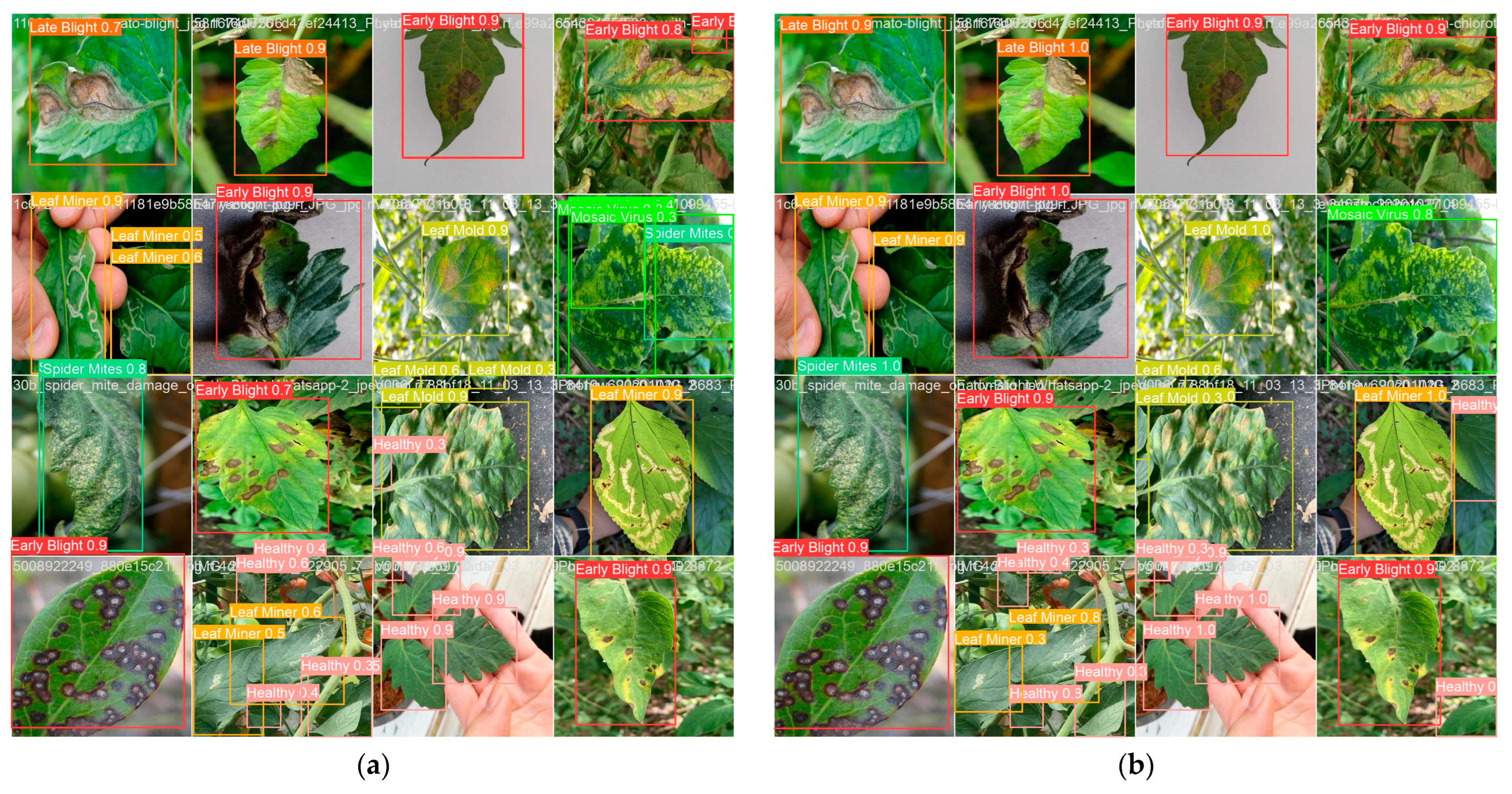 Figure 9b demonstrates that our proposed model produces bounding boxes that more precisely align with the actual lesion regions. Even under challenging conditions such as complex backgrounds and overlapping leaves, the model can accurately identify tomato leaf disease categories while significantly reducing false and missed detections. Moreover, the predicted confidence scores of our model are generally higher than those of the baseline model, enhancing the reliability and stability of the results. These findings clearly demonstrate that the proposed model possesses strong effectiveness and robustness for tomato leaf disease detection, making it well-suited for applications under varying environmental conditions.