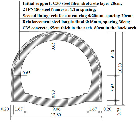 In the tunnel portal section, the primary support consists of a 0.2 m thick layer of C30 steel-fiber-reinforced shotcrete combined with double IPN180 steel arches spaced at 1.2 m. The secondary lining employs C35 reinforced concrete, with thicknesses of 0.8 m at the invert and 0.65 m at the crown. Assuming = 25 GPa and = 206 GPa, The equivalent elastic modulus adopted for the composite support system in the numerical model is = 68 GPa (see Appendix A for the derivation).