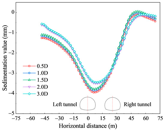 As shown in Figure 5, the ground surface settlement varies noticeably with face lag distance. At a face lag distance of 0.5 D, where D denotes the tunnel span, the maximum settlement reaches 3.95 mm. With increasing face lag distance, the maximum settlement decreases to 3.48 mm at 2.0 D—an 11.9% reduction relative to the 0.5 D case. Beyond this point, settlement values tend to stabilize. Notably, the maximum transverse surface settlement occurs on the left side of the middle rock pillar between the twin tunnels, mainly due to the superposition effect of sequential excavation. Table 4 presents a quantitative comparison of maximum settlements under different face lag distances.