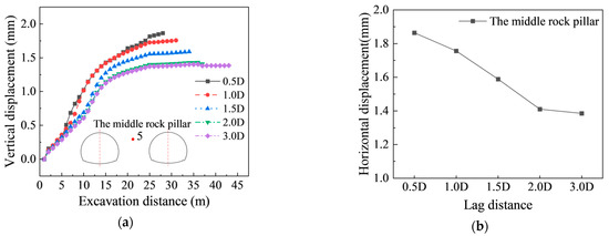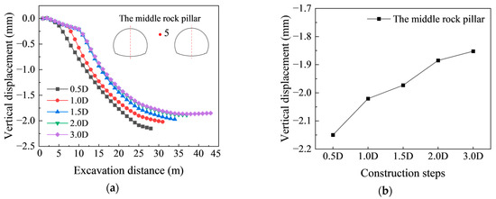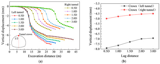 In closely spaced tunnels, the thin middle rock pillar serves as a structural weak point, prone to instability or failure under stress. Figure 7a,b illustrates the evolution of vertical displacement in the core zone of the middle rock pillar under different face lag distances. During excavation, vertical displacement accumulates progressively, and the maximum rate occurs when the working face reaches the target cross-section. After excavation, the displacement rate decreases. The final vertical displacement reduces with increasing face lag distance and tends to stabilize once the lag distance exceeds 2.0 D, beyond which further increases have a negligible effect.