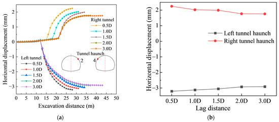 As shown in Figure 8a,b, the horizontal displacement at the tunnel waist exhibits a similar overall trend under different face lag distances. However, both the amplitude and duration of displacement fluctuations increase with greater face lag distance. The left tunnel generally shows larger horizontal displacement than the right due to the bias-loading effect. For example, at a face lag distance of 1.0 D, horizontal convergence at the monitoring point remains nearly stable while the excavation face is far from the target section. Once excavation approaches this section, displacement increases noticeably, and the influence extends approximately 15 m beyond it. As the face lag distance increases, the tunnel waist requires more excavation steps to reach deformation stability, rising from about 28 steps at 0.5 D to 37 steps at 2.0 D. This suggests that larger lag distances prolong the period of displacement fluctuation during excavation. Although the final magnitude of horizontal displacement remains comparable, extended fluctuations may raise the risk of local instability. Therefore, for greater face lag distances, more frequent monitoring and timely adjustment of temporary support are recommended to ensure construction safety.