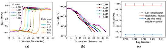 (2) With increasing face lag distance, stress redistribution in the surrounding rock becomes progressively stabilized. Stress variations are mainly concentrated in the middle rock pillar and haunch zones, particularly within approximately 15 m behind the excavation face, where the plastic zone is more extensive on the bias-loaded side. As the rear tunnel advances farther behind the leading face, the stress release and load transfer zones become more spatially separated, reducing overlapping unloading effects and lowering the stress concentration. This behavior reflects a gradual transition from strong mechanical interaction to relative decoupling between the twin tunnels when the face lag distance approaches about 2.0 D.