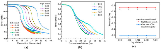 In the core zone of the middle rock pillar (Figure 10b), the maximum principal stress stabilizes at −0.33 MPa, irrespective of the face lag distance. This stability mainly results from the symmetric tunnel geometry and the initial in situ stress field applied in the model. Under shallow-buried and biased loading conditions, despite differences in excavation sequence and face lag distance between the left and right tunnels, the stress within the middle rock pillar is dominated by superimposed compression. The principal stress is primarily governed by the overall overburden pressure and the self-weight of the surrounding rock, rather than by local excavation disturbances. Comparing the 2.0 D and 1.0 D cases shows that a smaller face lag distance requires fewer excavation steps to achieve the same stress reduction. This indicates that stress concentration and release are more pronounced, with stronger superimposition between the two tunnels. As the face lag distance increases, stress interaction gradually weakens, and the stress influence zones of the two tunnels become more separated. In summary, when the face lag distance reaches 2.0 D or greater, the superimposition between the twin tunnels is effectively mitigated, thereby enhancing the stability of the surrounding rock.